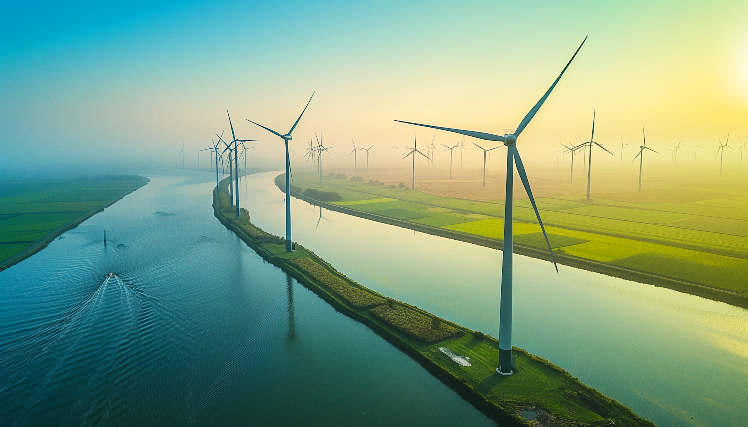 Scenic view of a river with wind turbines, lush fields, and a boat cruising under a golden sky, symbolizing sustainable energy.