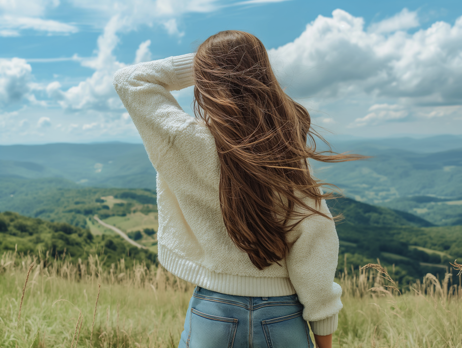 Woman in white sweater and jeans overlooks scenic green hills under a blue sky with clouds, capturing a moment of tranquility.