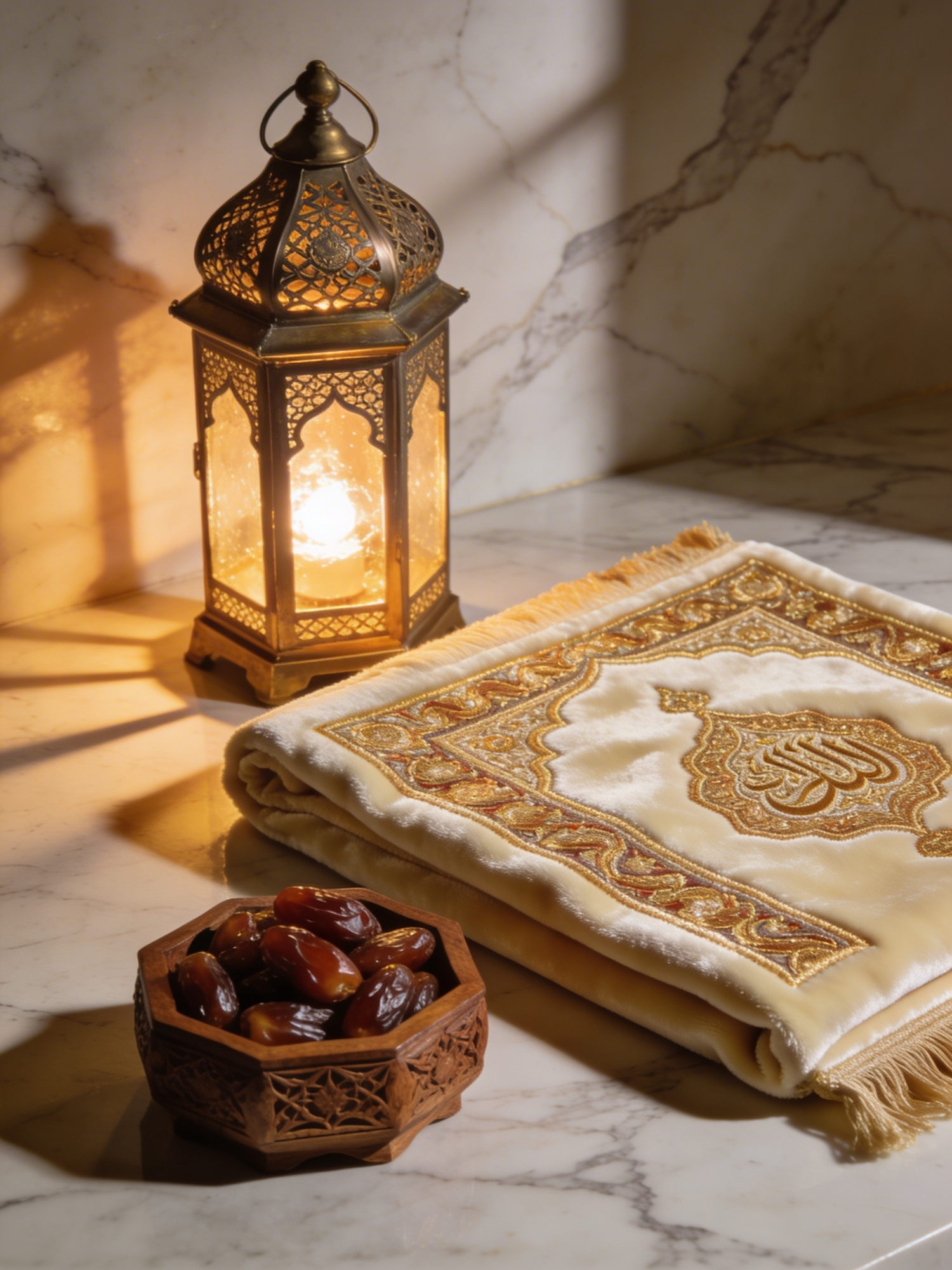 A high‑definition luxury editorial still life. A glowing ornate lantern sits beside a folded velvet prayer mat in deep cream with gold embroidery. A carved container of dates adds cultural depth. Soft warm light casts elegant shadows across a marble background. No text, no logos.
