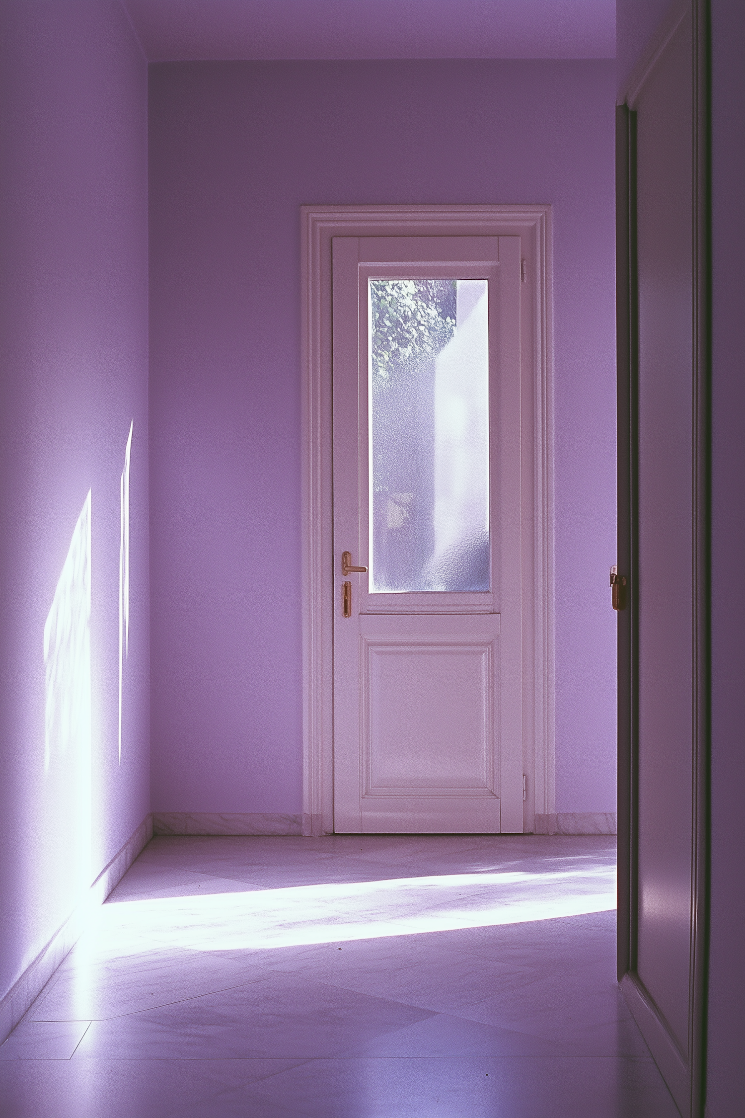 A minimalist hallway with lavender walls, a white door with frosted glass, and sunlight casting soft shadows on a marble floor.