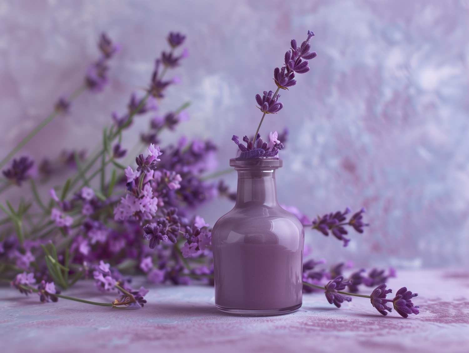 Lavender sprigs surround a glass bottle filled with lavender liquid, set against a soft pastel background.
