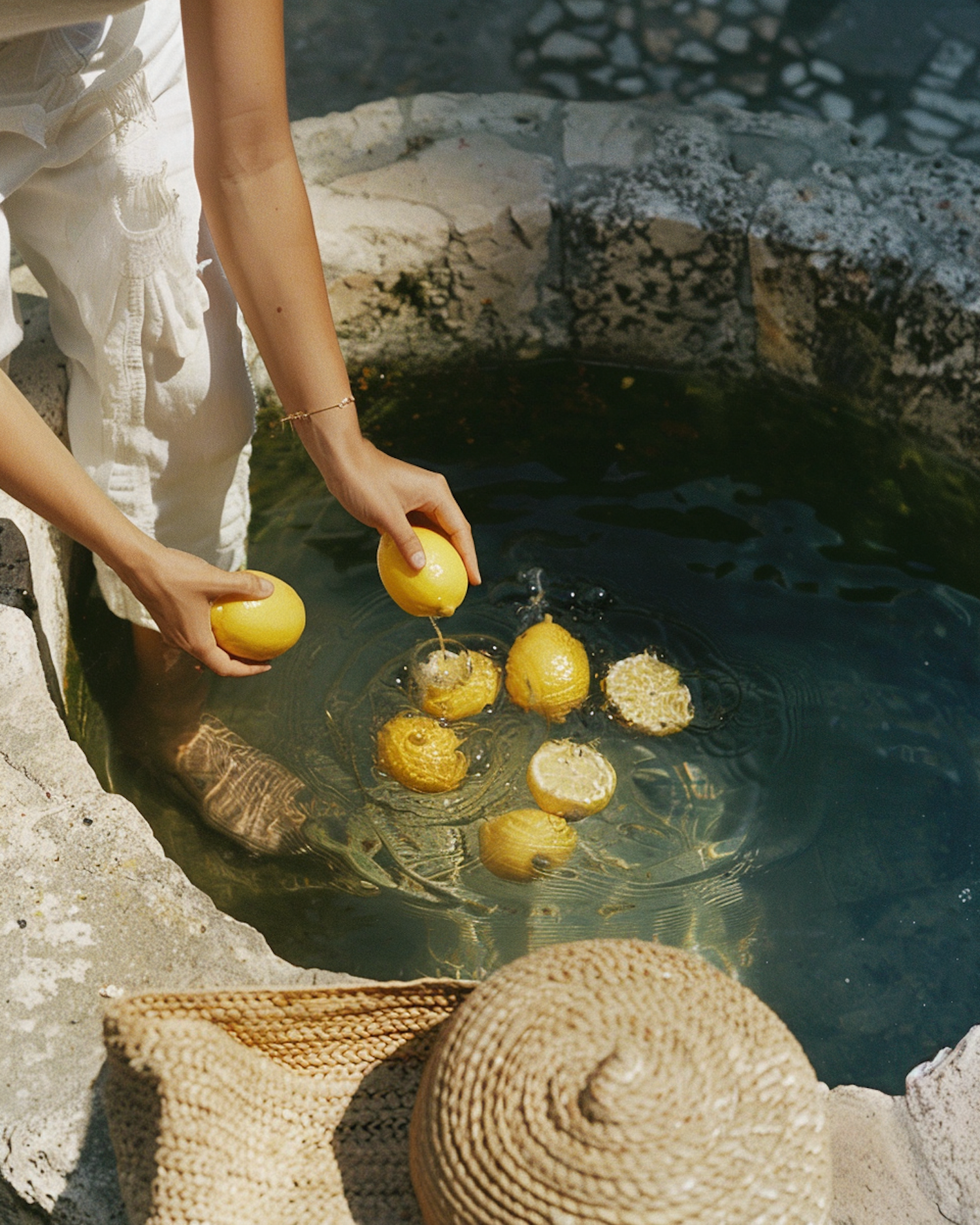 Person washing lemons in a stone basin with sunlight, straw hat, and bag nearby, creating a rustic summer vibe.