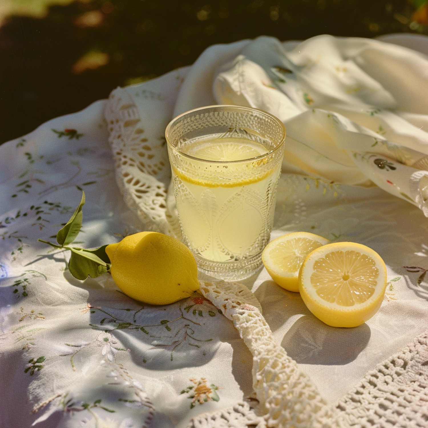 Elegant glass of lemonade with fresh lemons on an embroidered tablecloth, bathed in sunlight for a refreshing summer vibe.