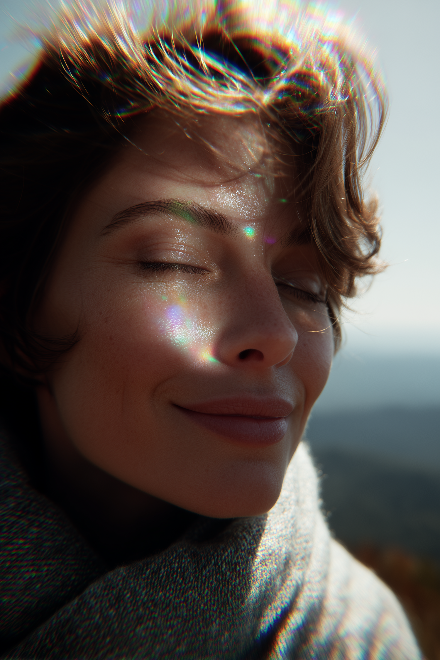 Close-up of a serene person in sunlight, rainbow reflection on their face, short hair, blurred natural background.
