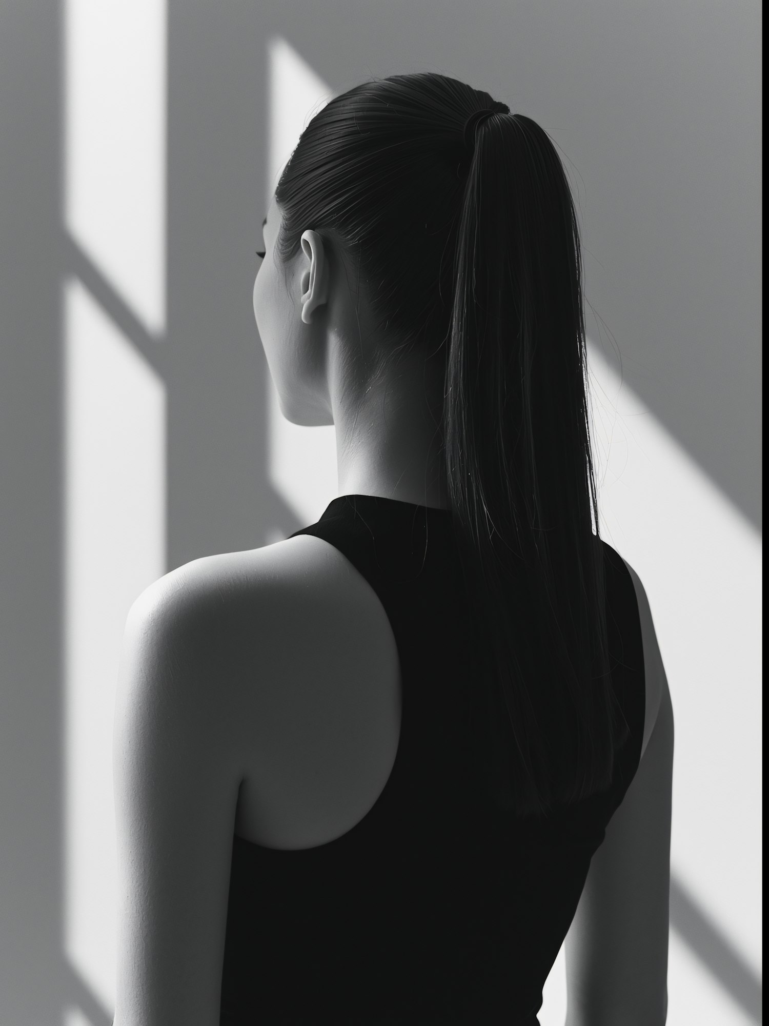 Monochrome image of a woman with a ponytail in a black top, standing in soft light with geometric shadows on the wall.