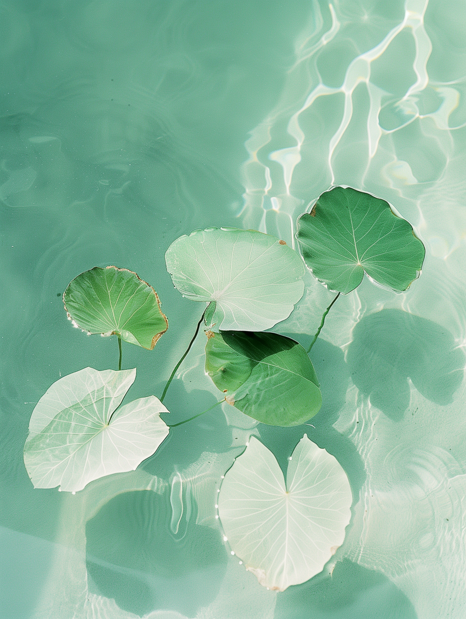 Serene lotus leaves floating on clear turquoise water, creating a tranquil and harmonious scene with gentle ripples and soft light.