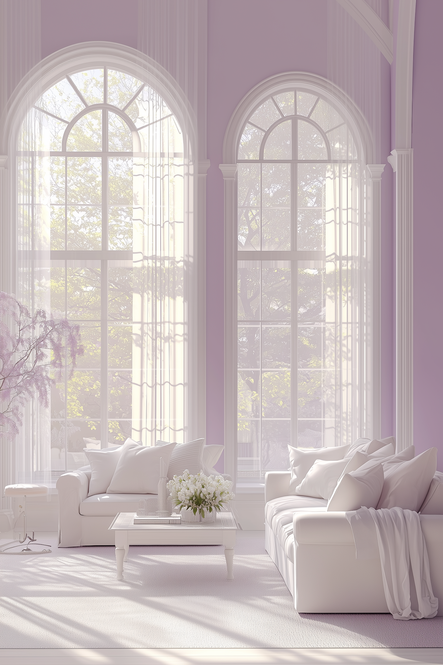 Bright living room with lavender walls, arched windows, white sofas, and soft natural light creating a serene and elegant vibe.