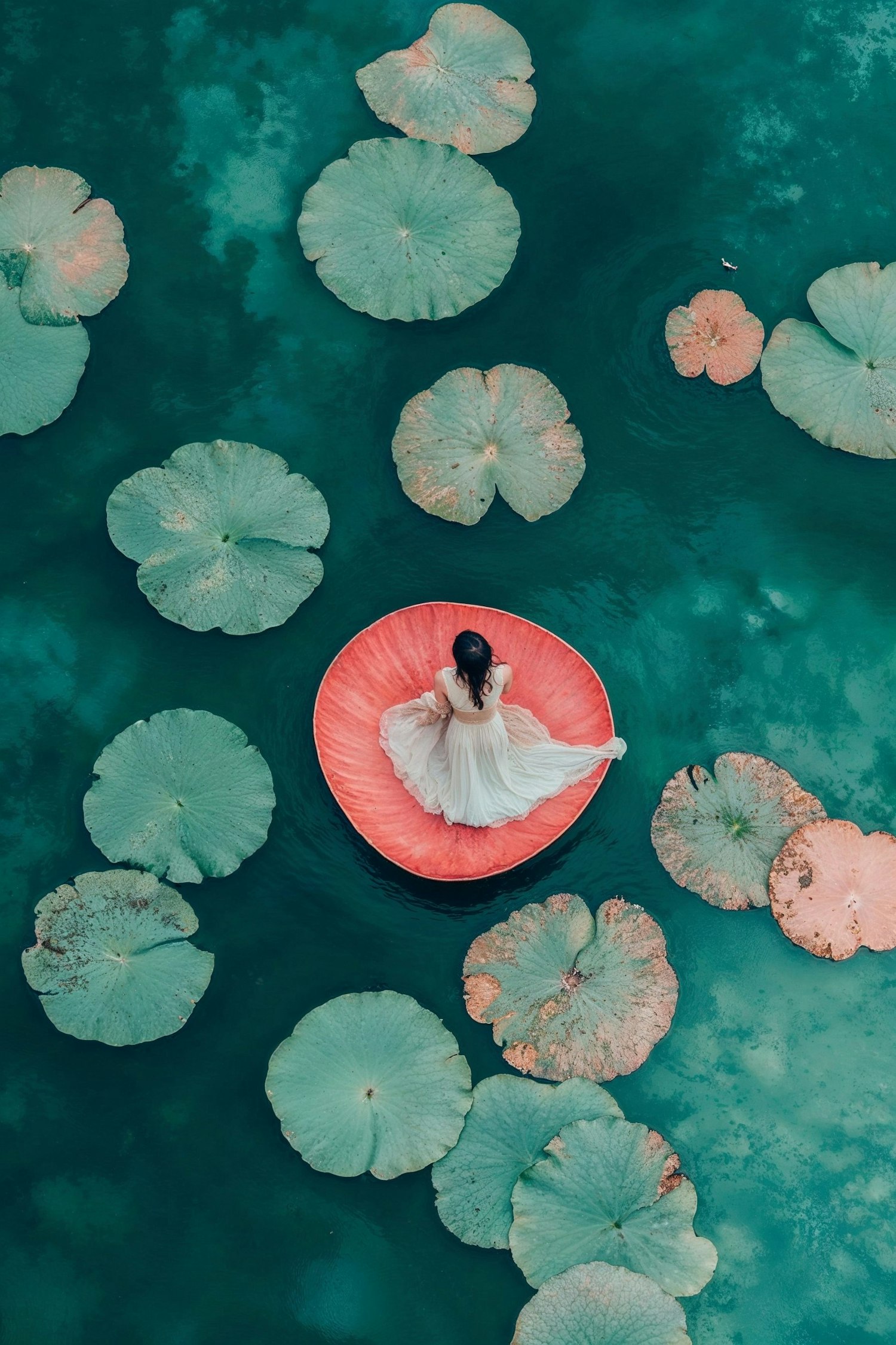 A woman in a white dress sits on a pink lotus leaf surrounded by green leaves on tranquil teal water, creating a serene, dreamlike scene.