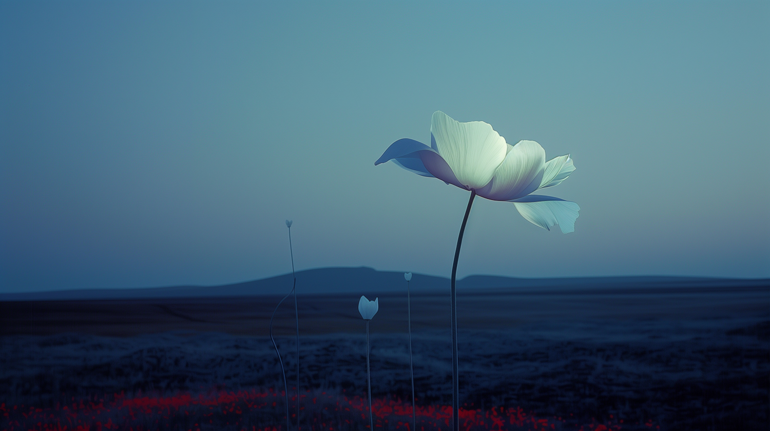 A luminous white flower glows against a serene, dimly lit landscape with hints of red flowers and silhouetted hills.