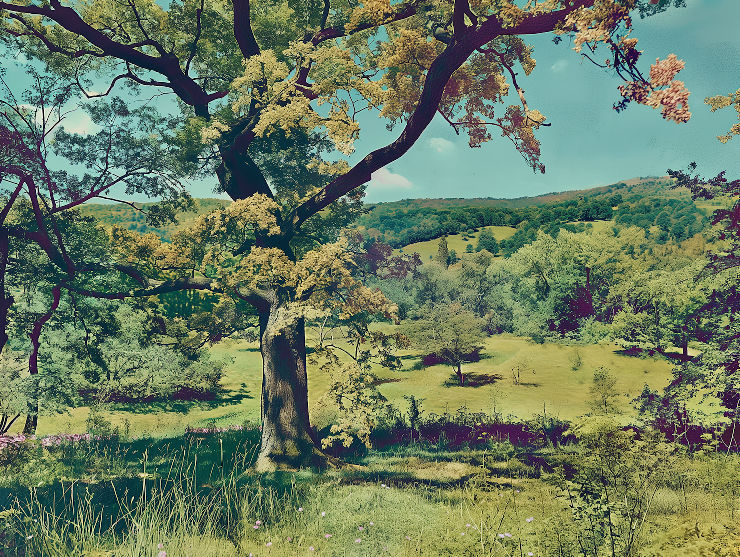 Majestic tree with sprawling branches in a lush green landscape under a bright blue sky, exuding tranquility and natural beauty.
