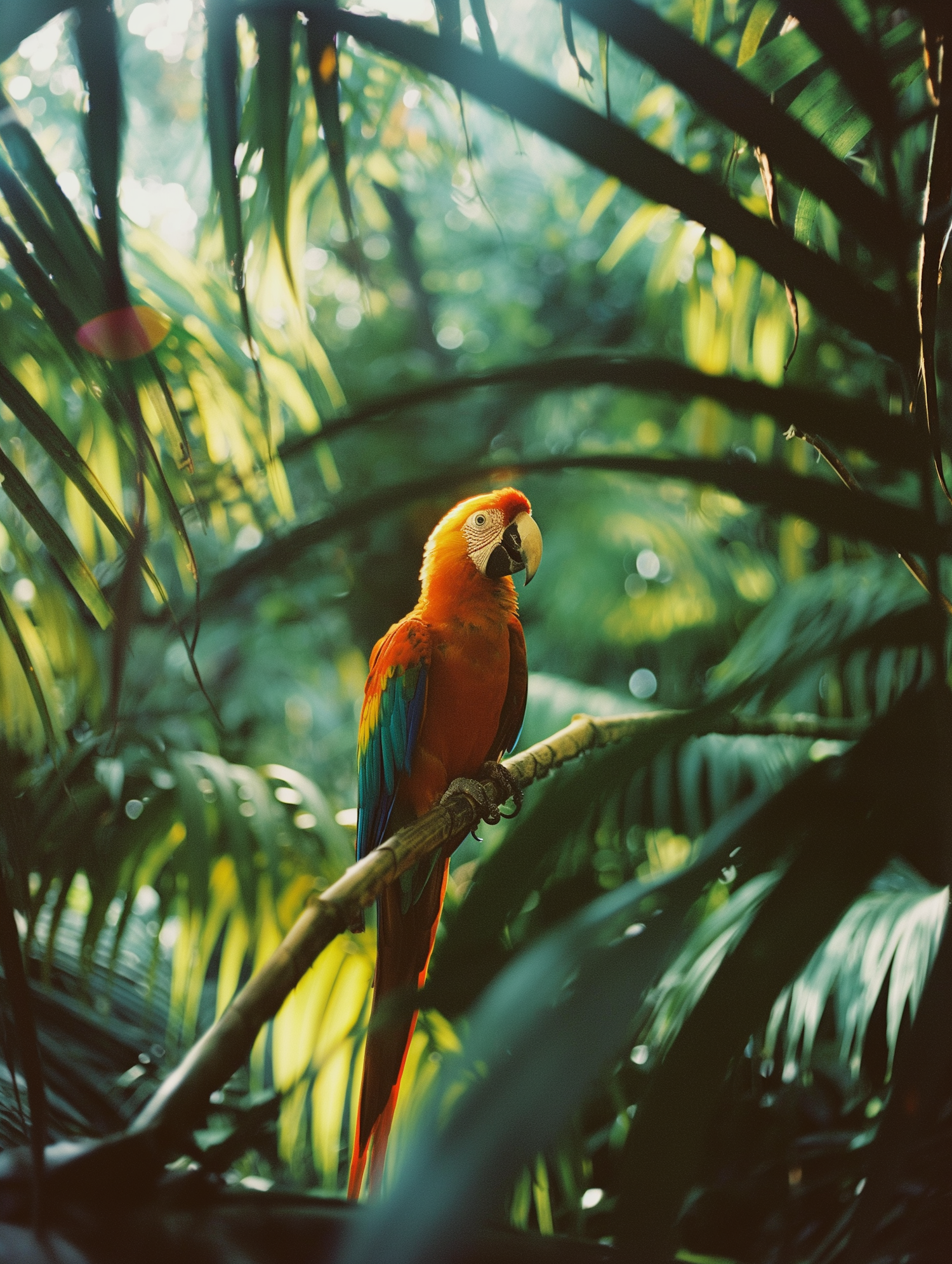 A vibrant scarlet macaw perched on a branch in a lush jungle, surrounded by green palm leaves and dappled sunlight.