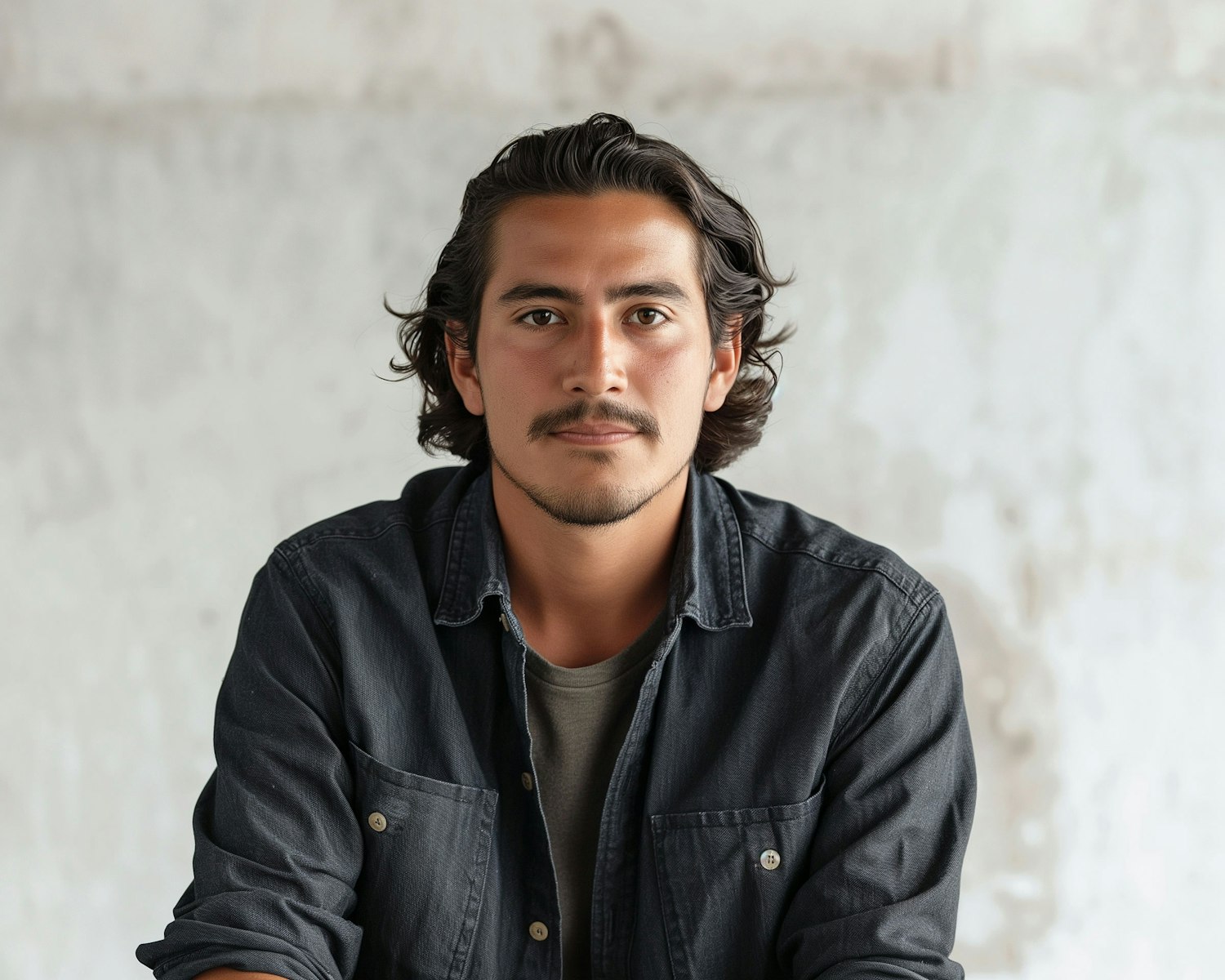 Portrait of a man with black hair and mustache in a denim shirt, set against a minimalist white background.