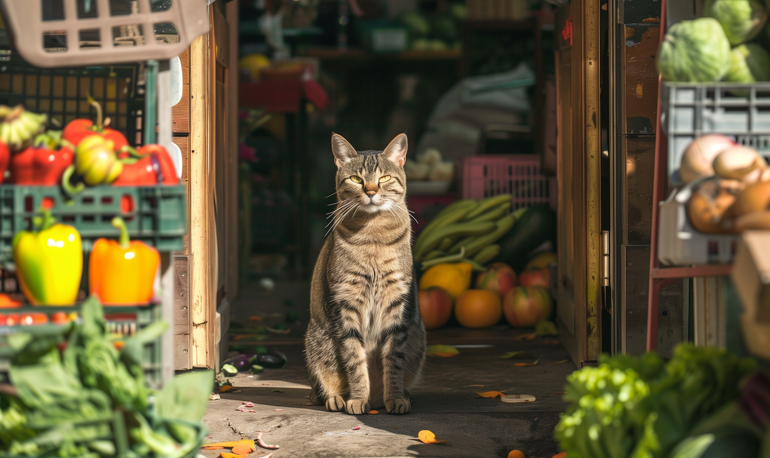 A tabby cat sits among colorful crates of fresh produce in a sunlit market, exuding a relaxed and content vibe.
