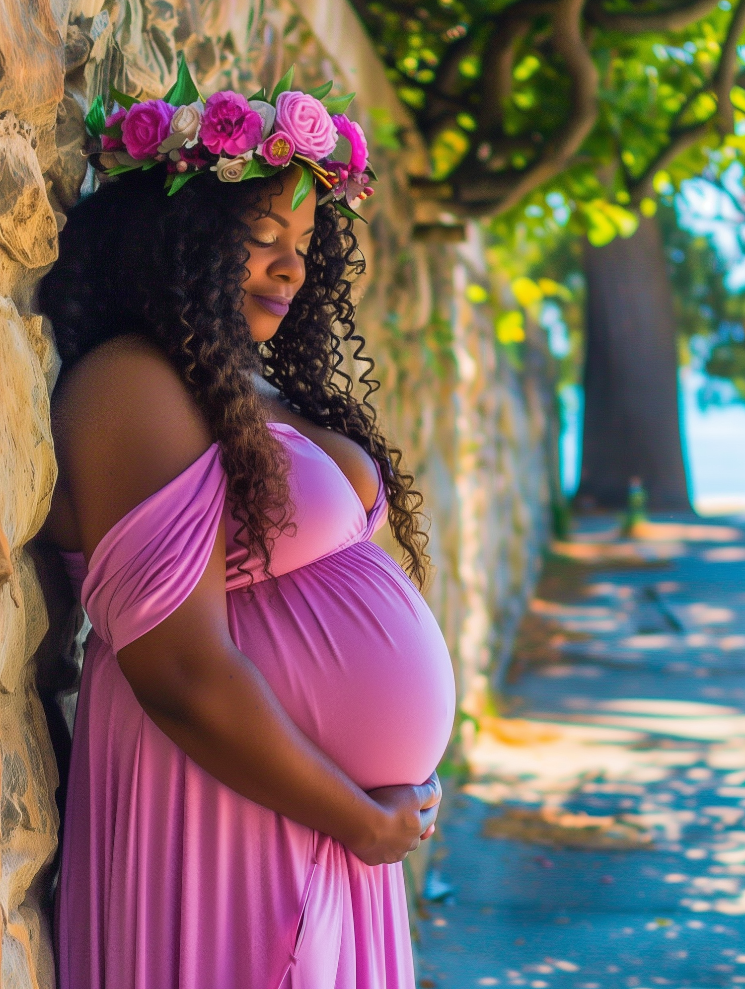 Pregnant woman in a pink dress with a floral crown, standing by a stone wall in a sunlit, tree-lined path.