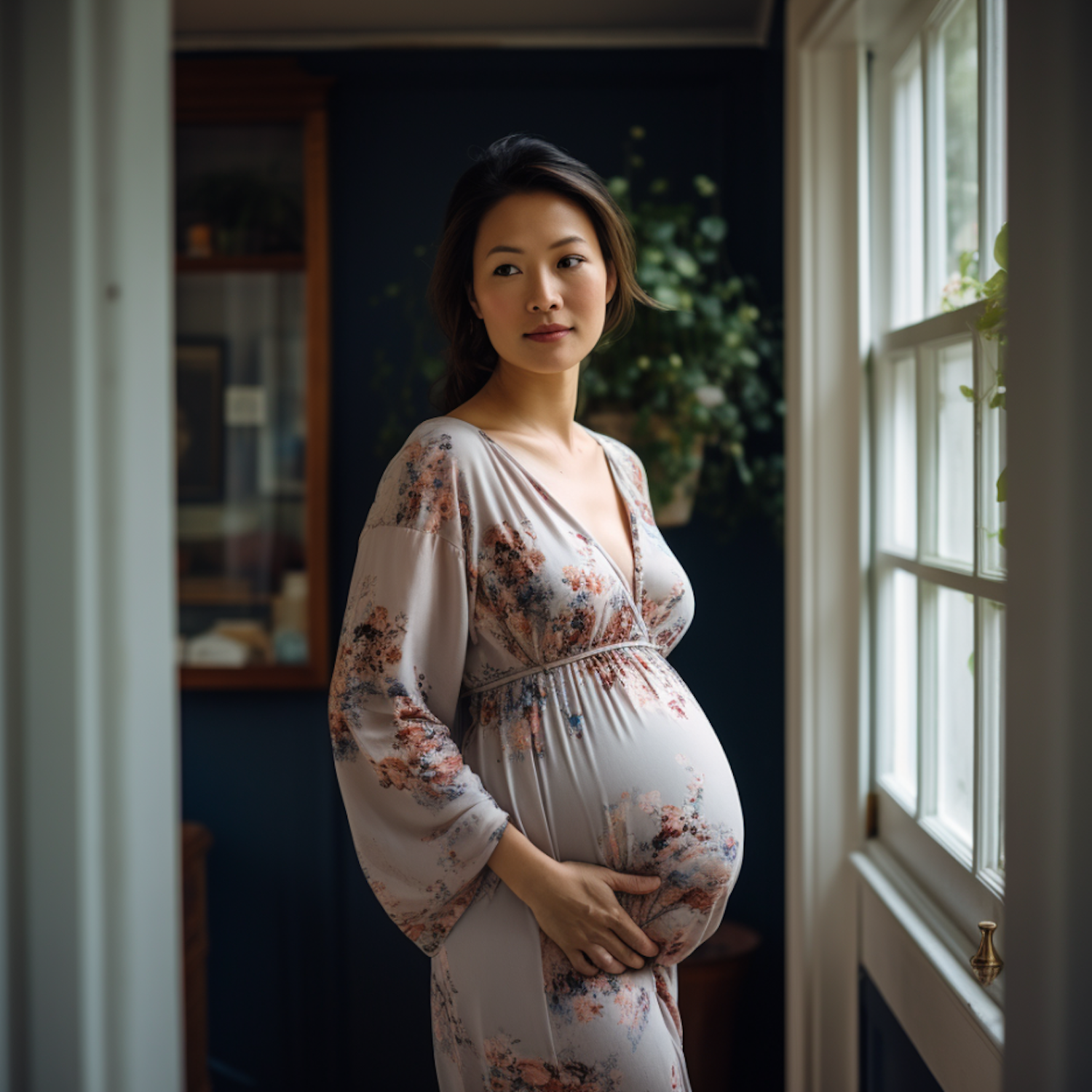Pregnant woman in a floral dress stands by a window, cradling her belly. Soft light and serene expression create a peaceful atmosphere.