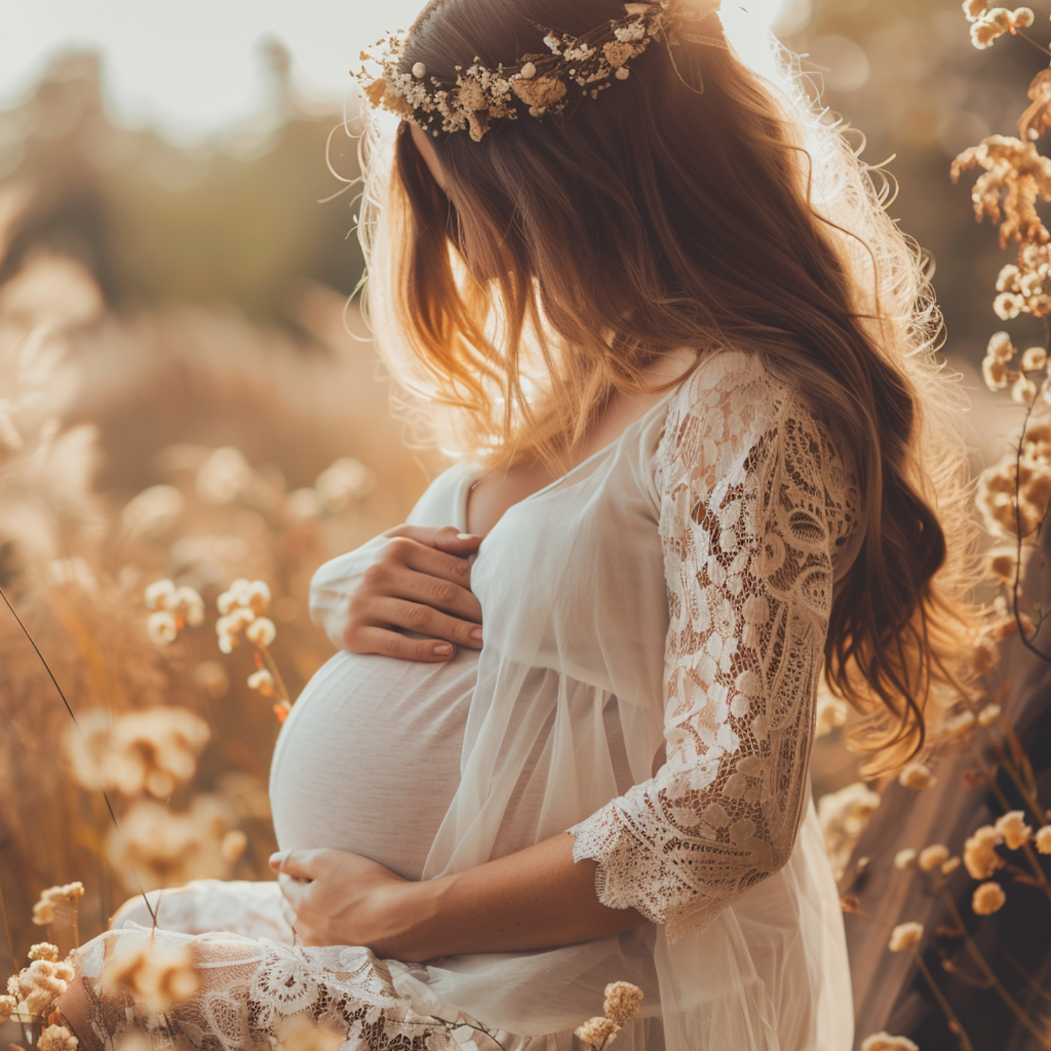 Pregnant woman in a lace dress with a floral crown, sitting in a sunlit field, surrounded by golden grasses.