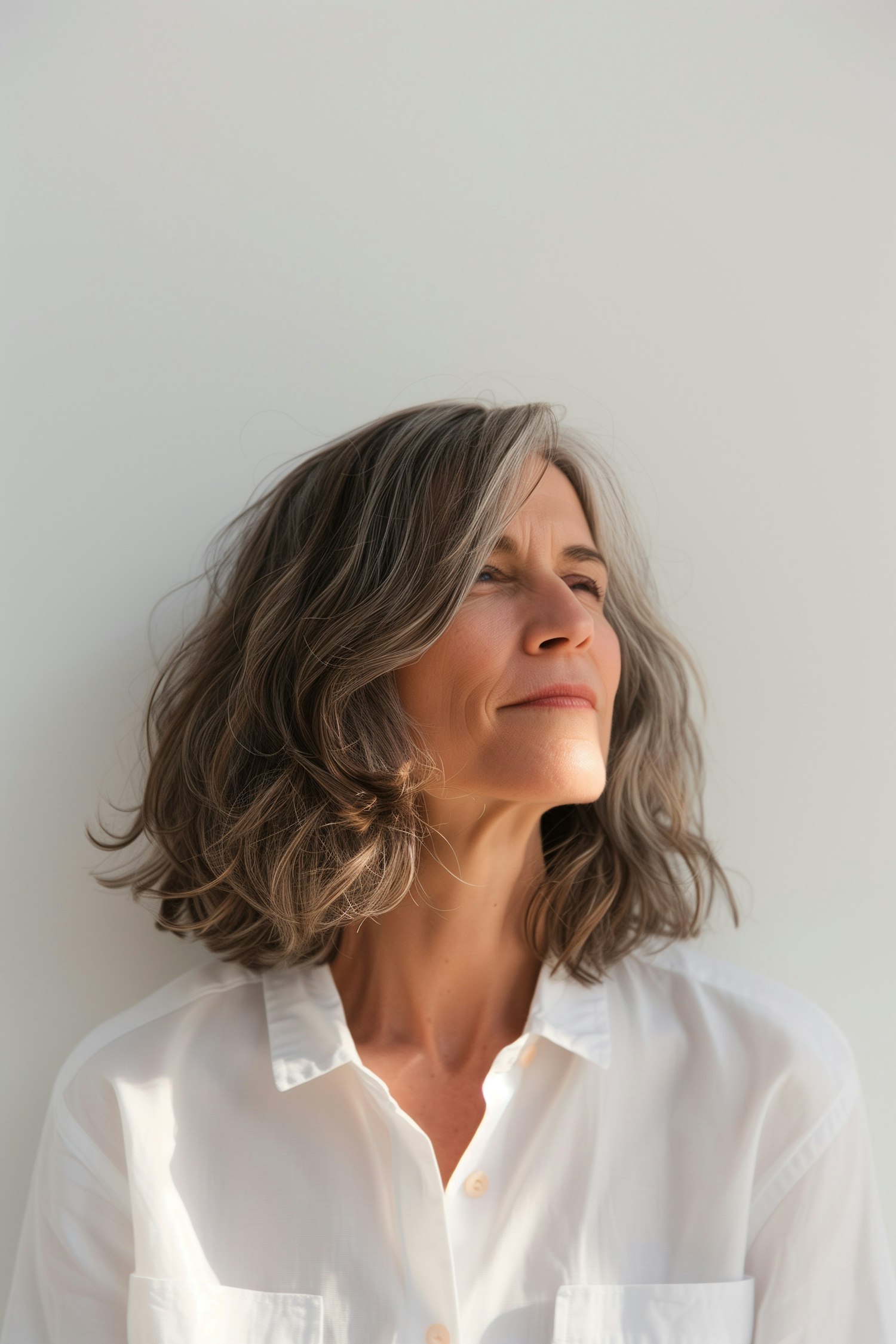 Serene woman with gray hair in a white shirt gazes upward against a light background, capturing elegance and simplicity.