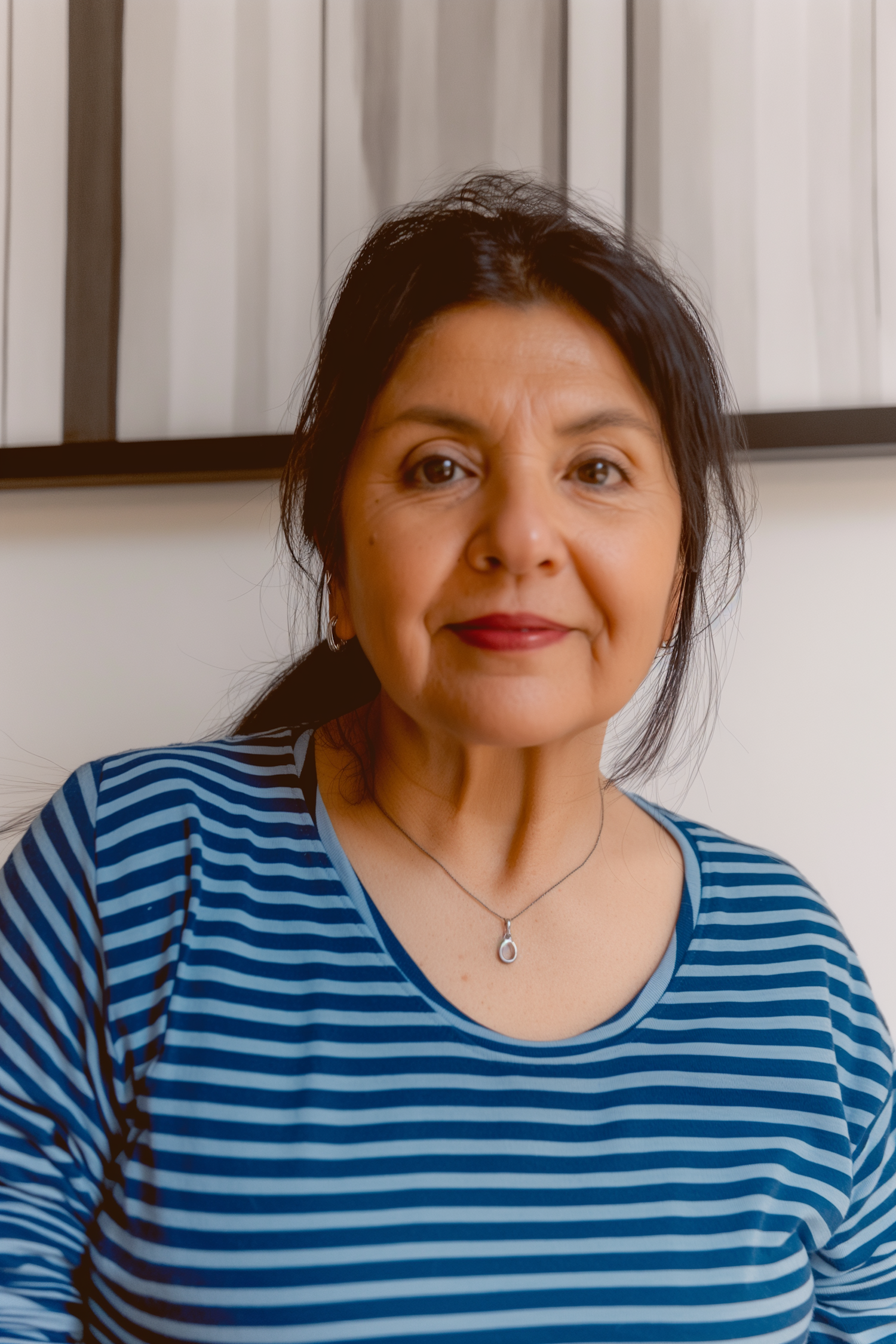 Middle-aged woman in a blue striped shirt with a necklace, set against a modern abstract background.