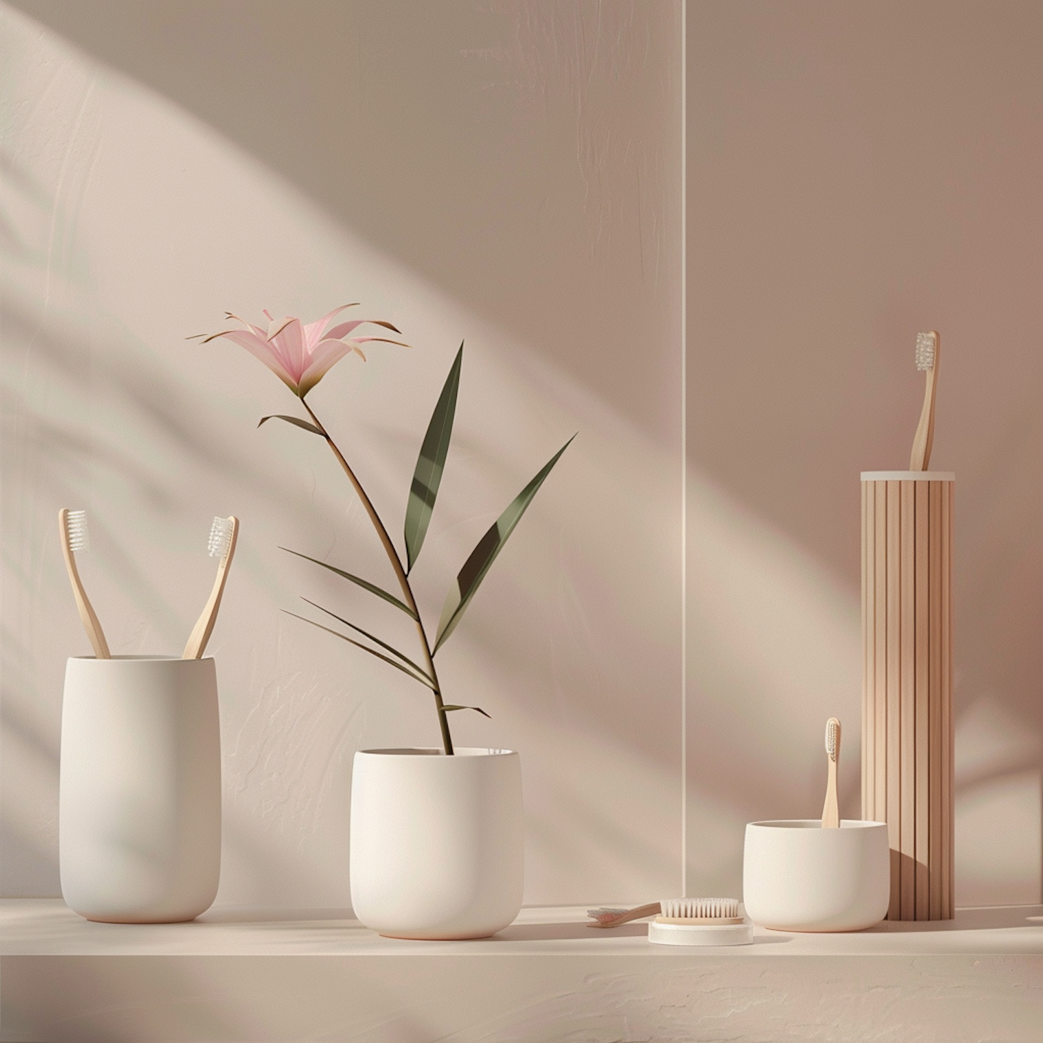 Minimalist bathroom decor with bamboo toothbrushes and a pink flower in white ceramic holders, set against a soft beige background.