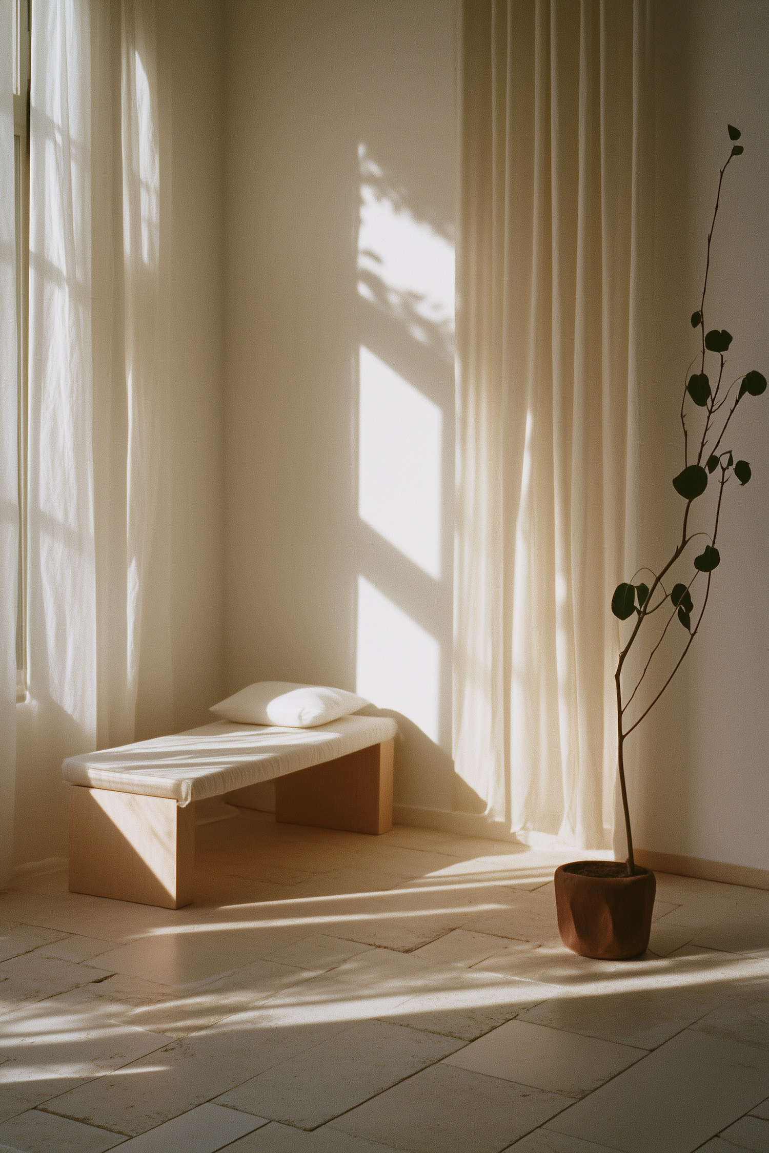 Minimalist room with soft lighting, a wooden bench, sheer curtains, and a potted plant, creating a serene and elegant ambiance.