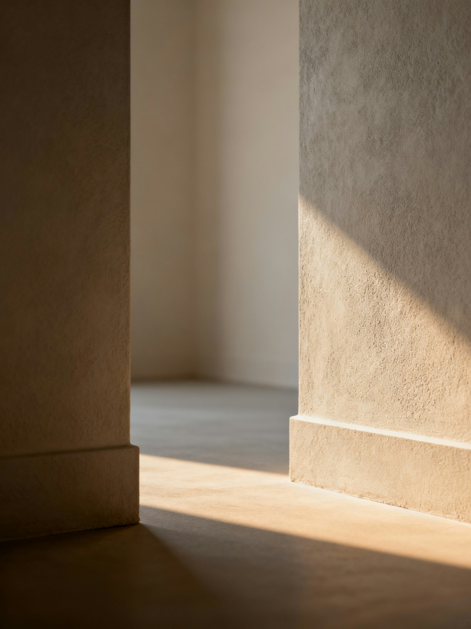 A close-up of a textured wall corner with warm light and a soft gradient of shadows. Subtle architectural lines, modern minimalist interior style, neutral palette, no clutter, no furniture, no people. Designed to be used as a background.
