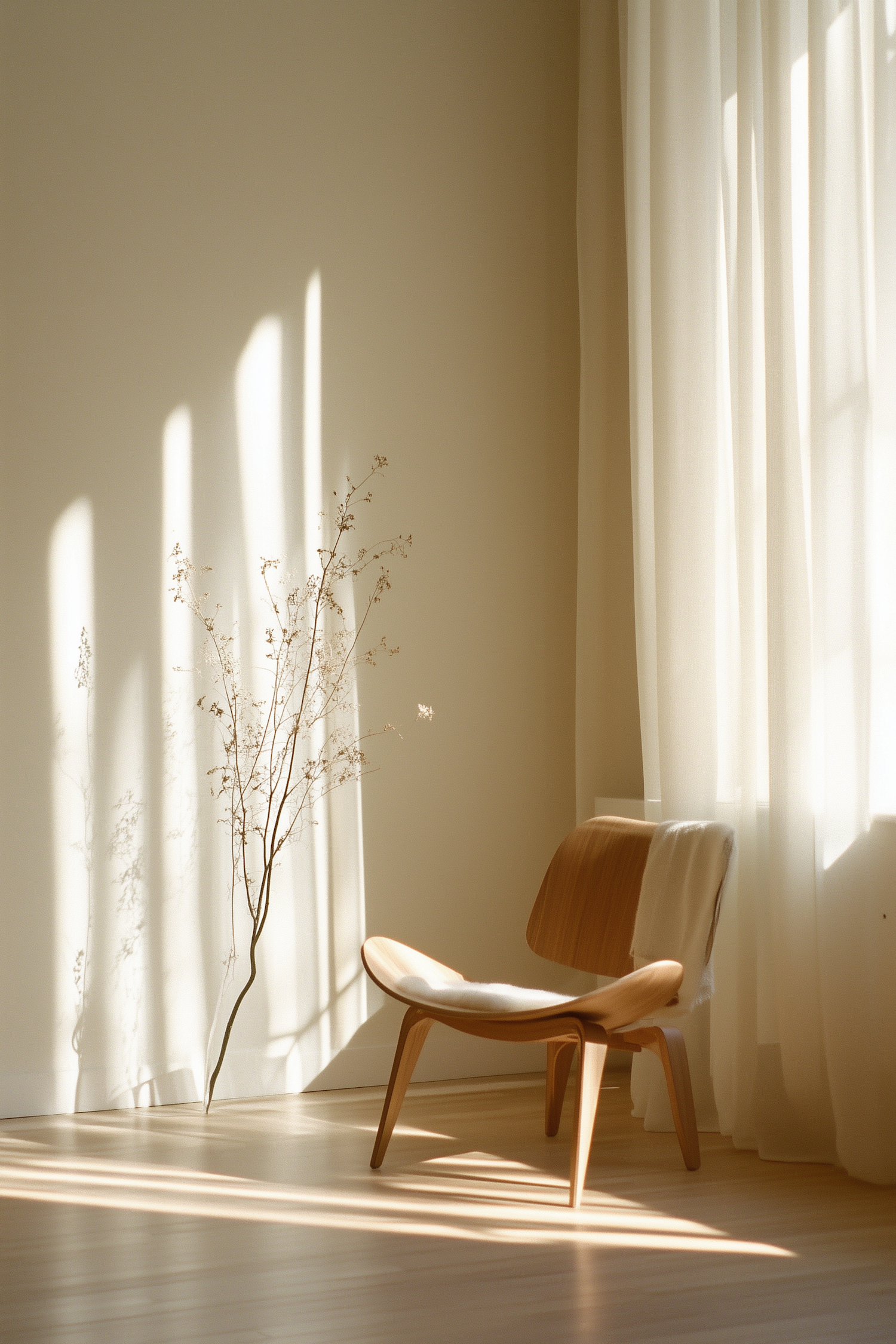 Minimalist room with a wooden chair, soft lighting, and sheer curtains. Sunlight casts gentle shadows, creating a serene atmosphere.