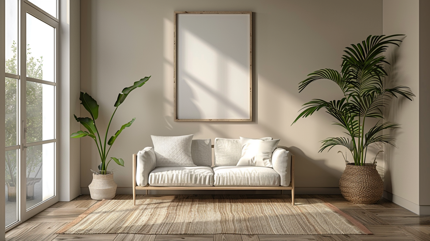 Minimalist living room with a cozy sofa, large plants, and sunlight streaming through a window, creating a serene atmosphere.
