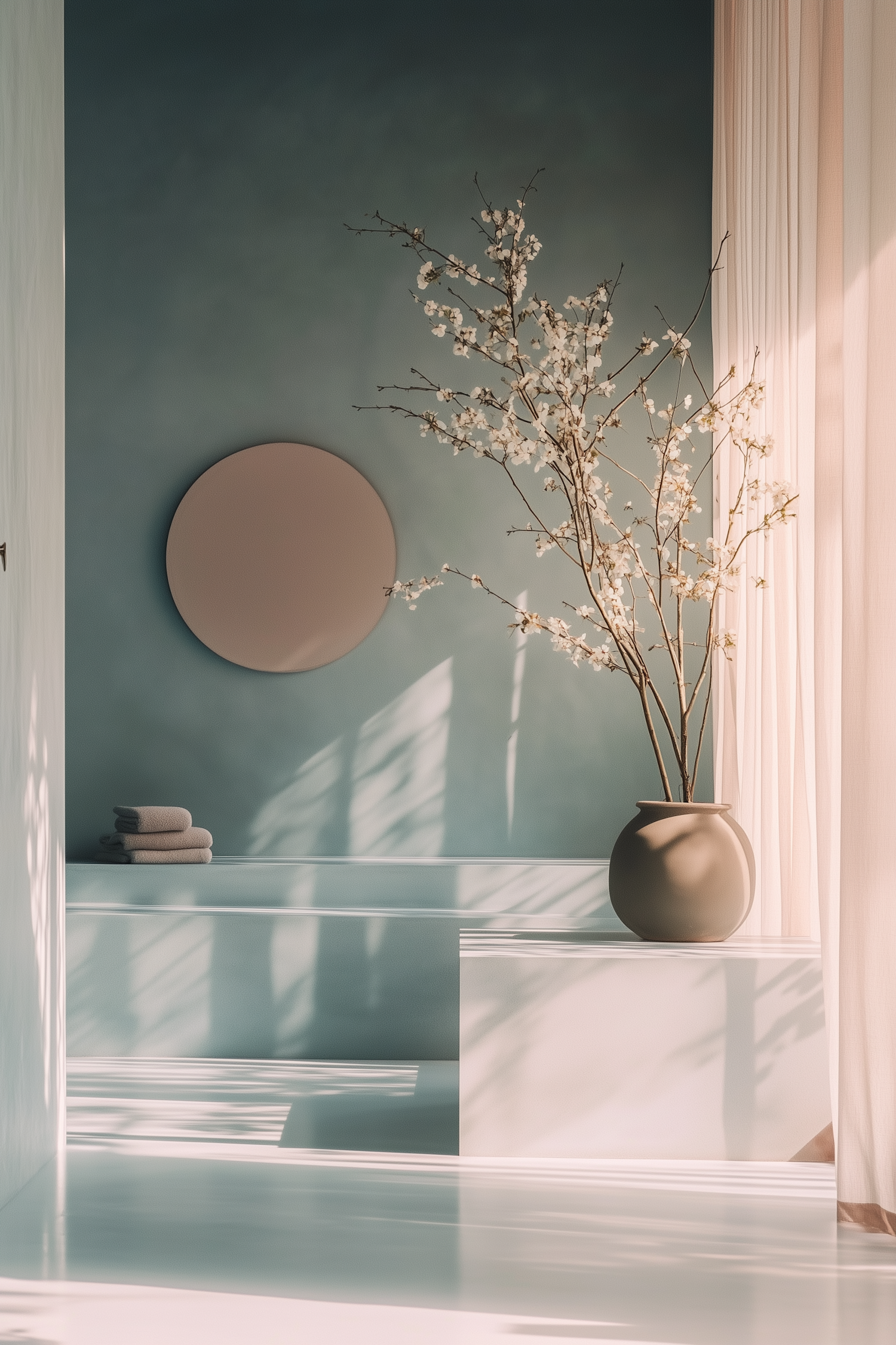 Serene interior with teal walls, a round mirror, and a vase of white blossoms. Soft light and shadows create a tranquil atmosphere.