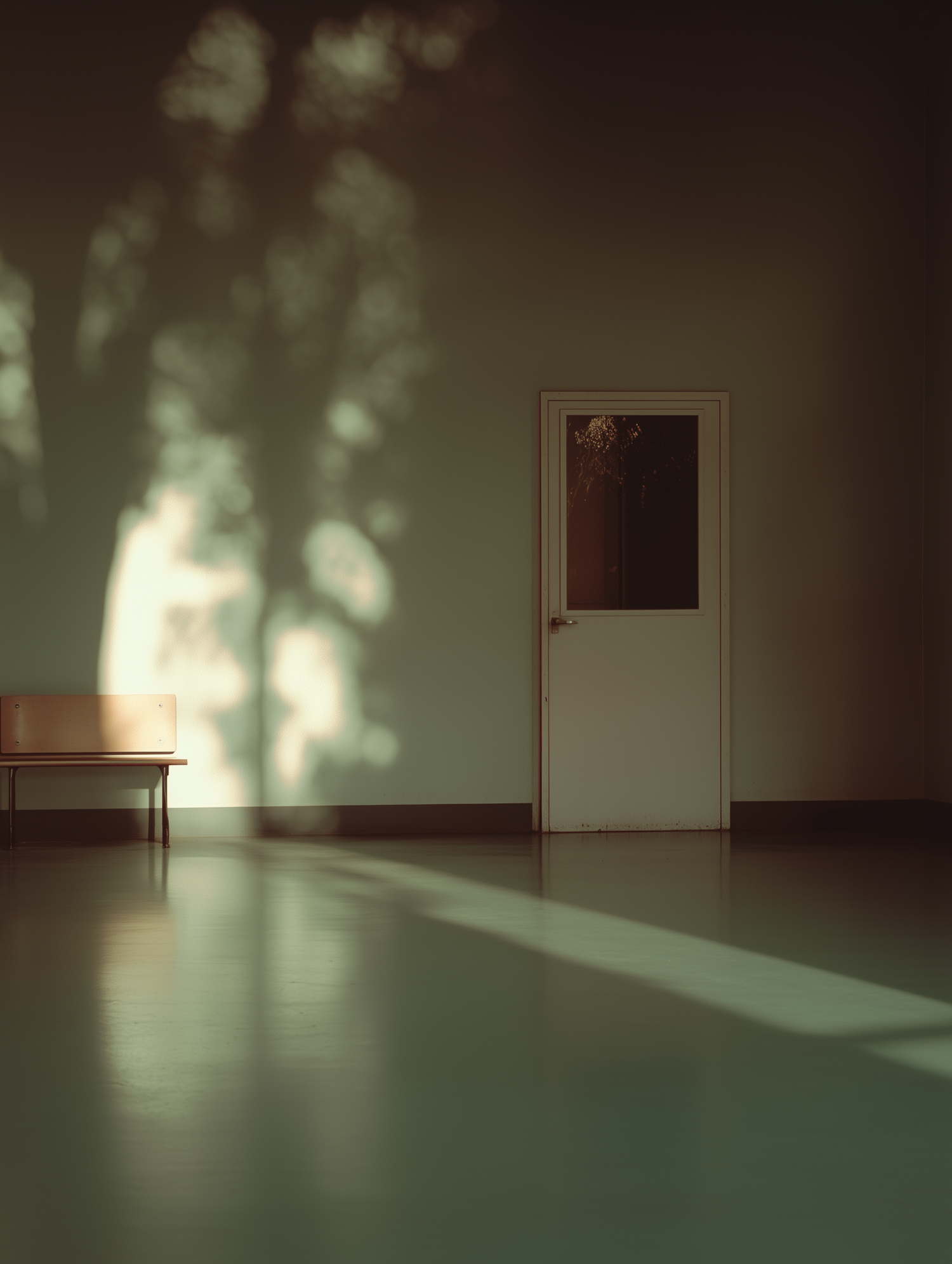 Minimalist room with green walls, a wooden bench, and sunlight casting tree shadows. A white door adds to the serene atmosphere.