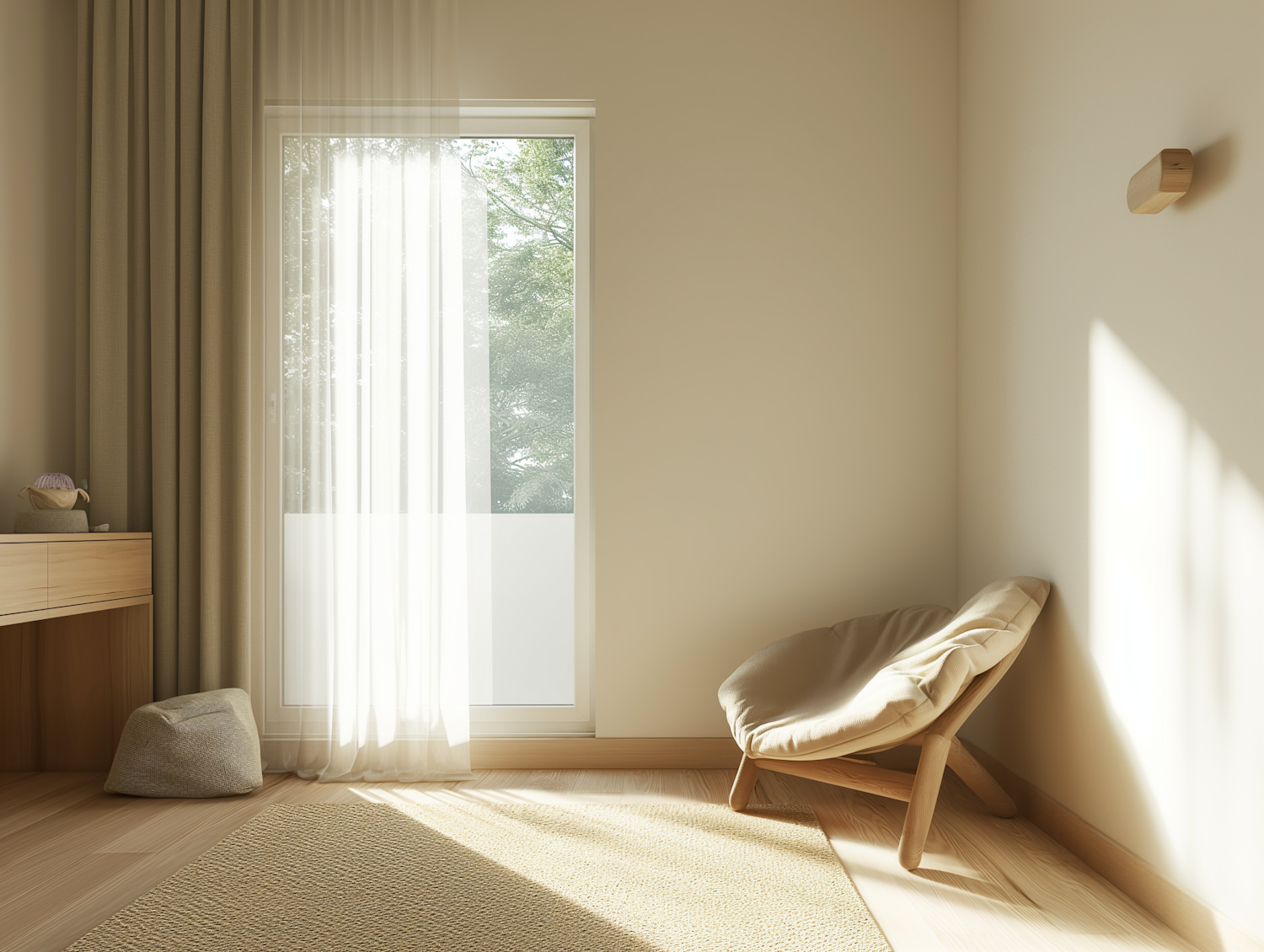 Minimalist room with natural light, featuring a cozy beige chair, sheer curtains, and wooden accents for a serene atmosphere.