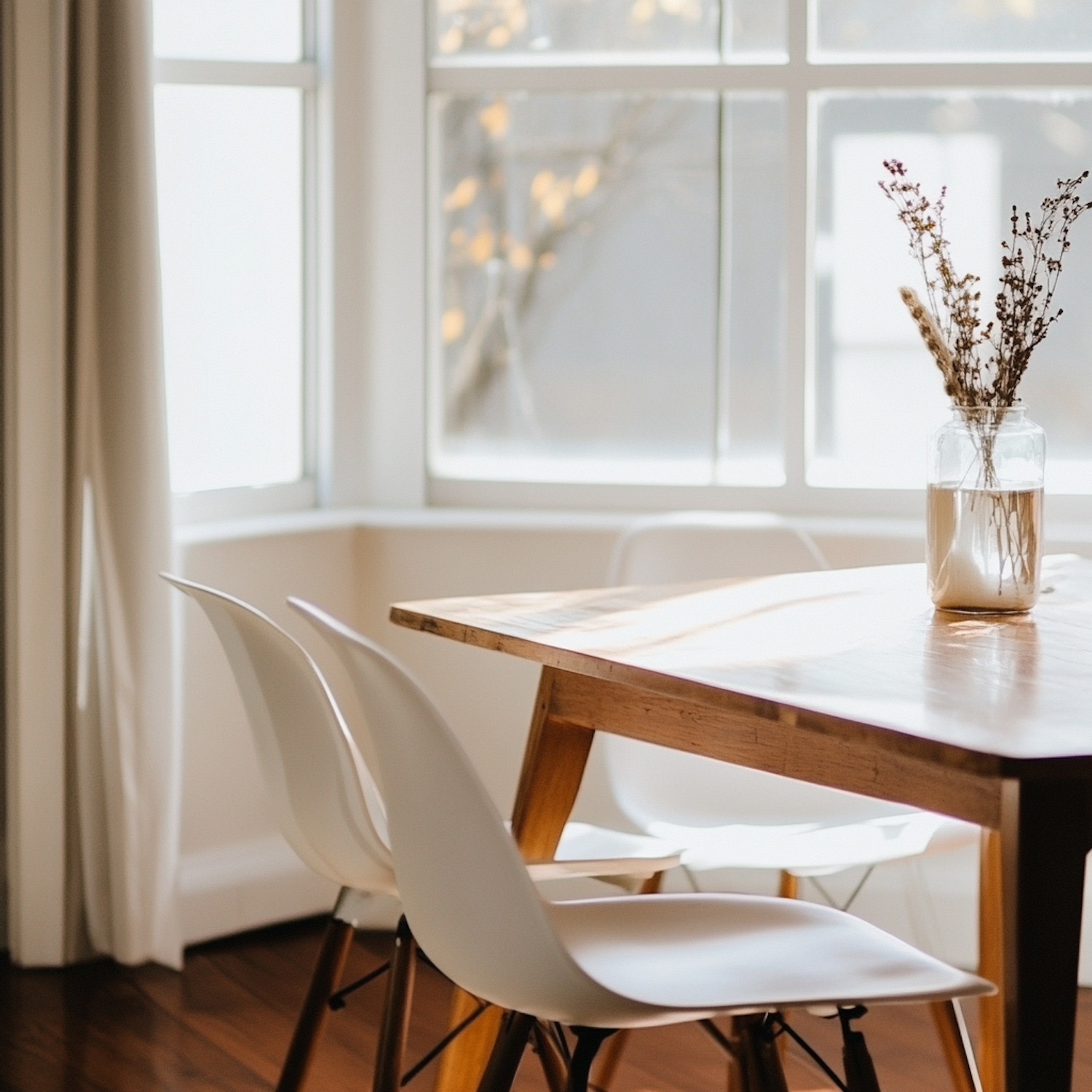 Sunlit dining area with a wooden table, white chairs, and a jar of dried flowers. Bright and minimalist decor.
