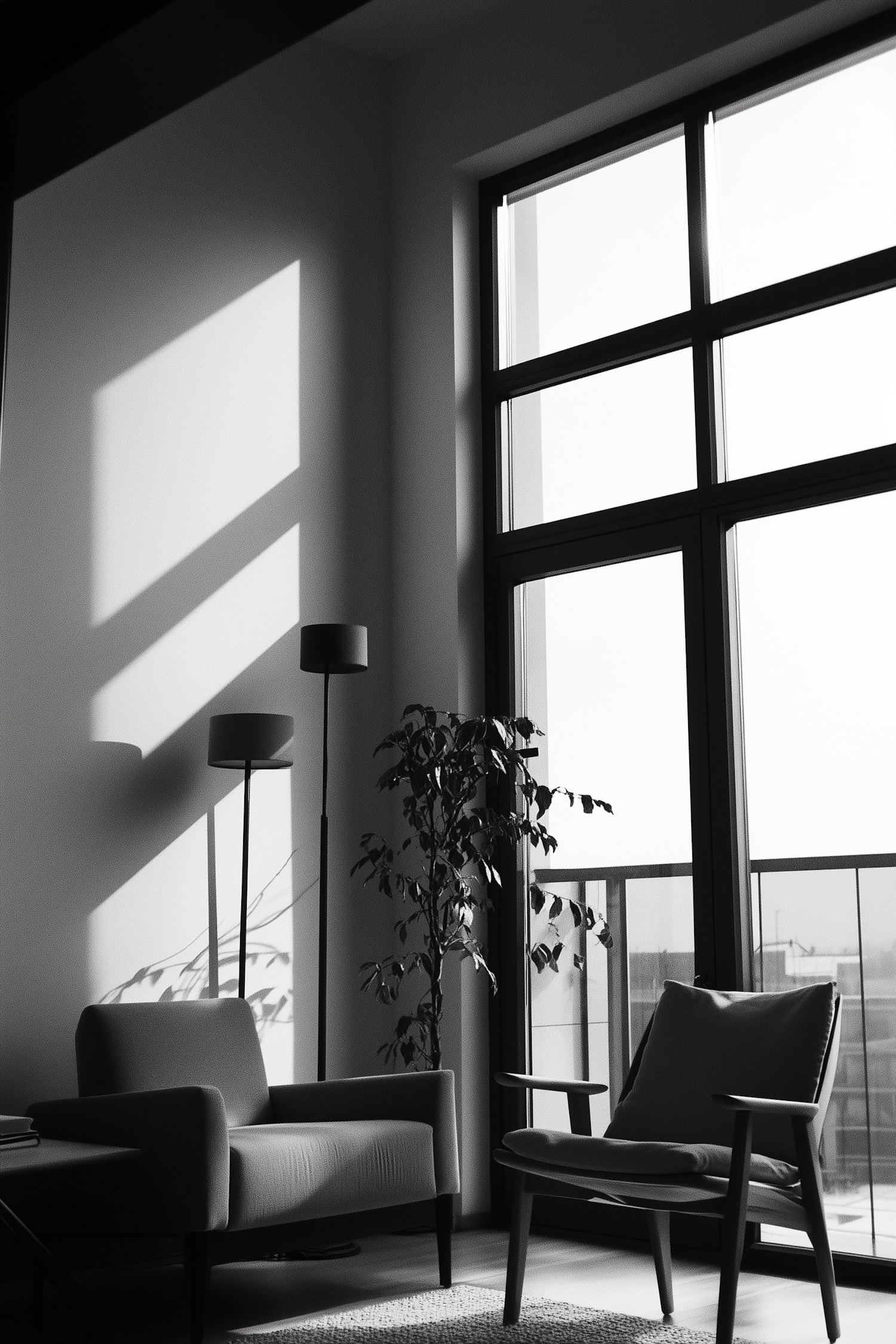 Minimalist living room with modern furniture, large window, and natural light casting shadows. Elegant and serene interior design.