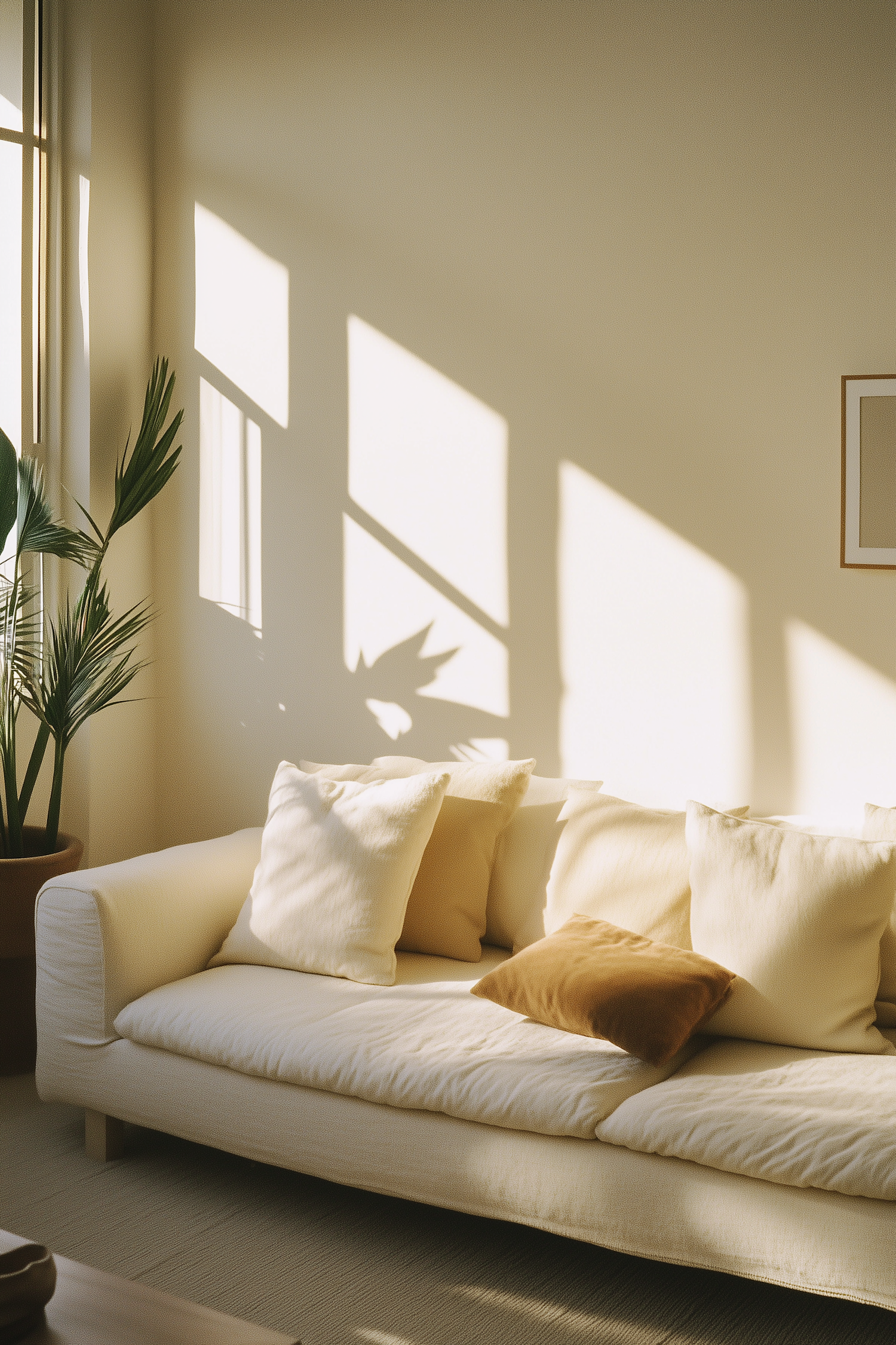 Sunlit living room with a beige sofa, cream cushions, and a potted plant, creating a cozy and minimalist atmosphere.