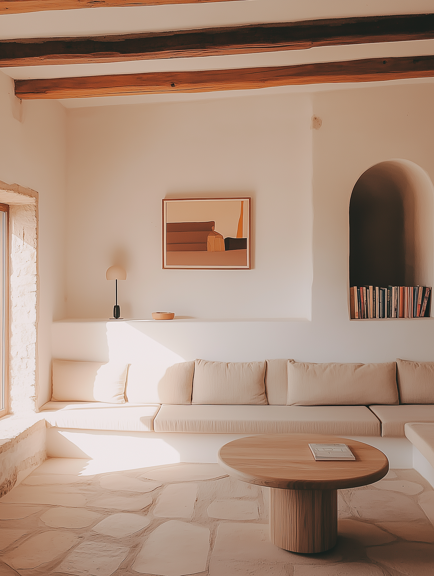 Warm, minimalist living room with beige sofa, wooden coffee table, and rustic ceiling beams. Natural light enhances the cozy ambiance.