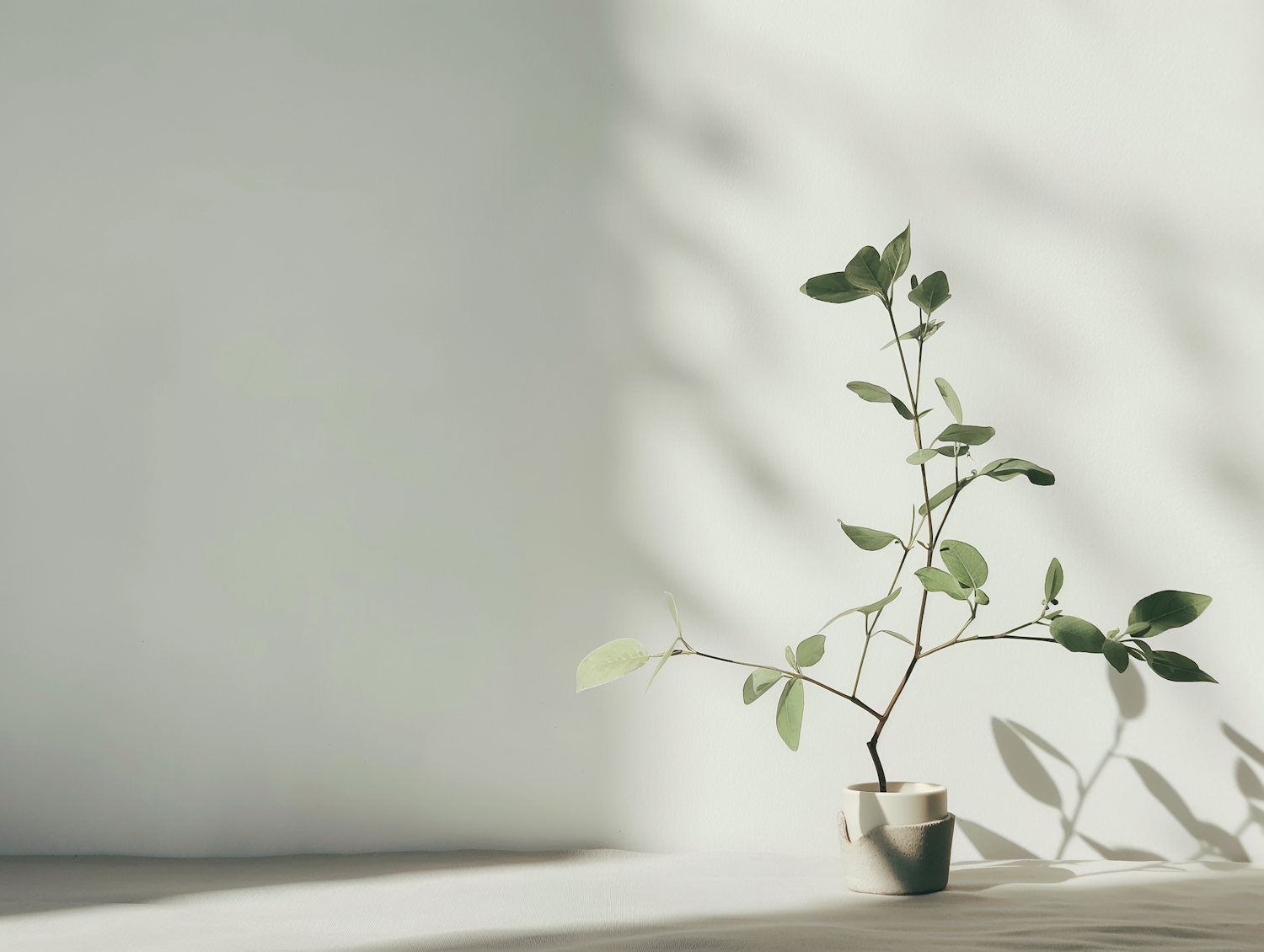 Minimalist potted plant casting soft shadows on a pale wall, creating a serene and uncluttered aesthetic.