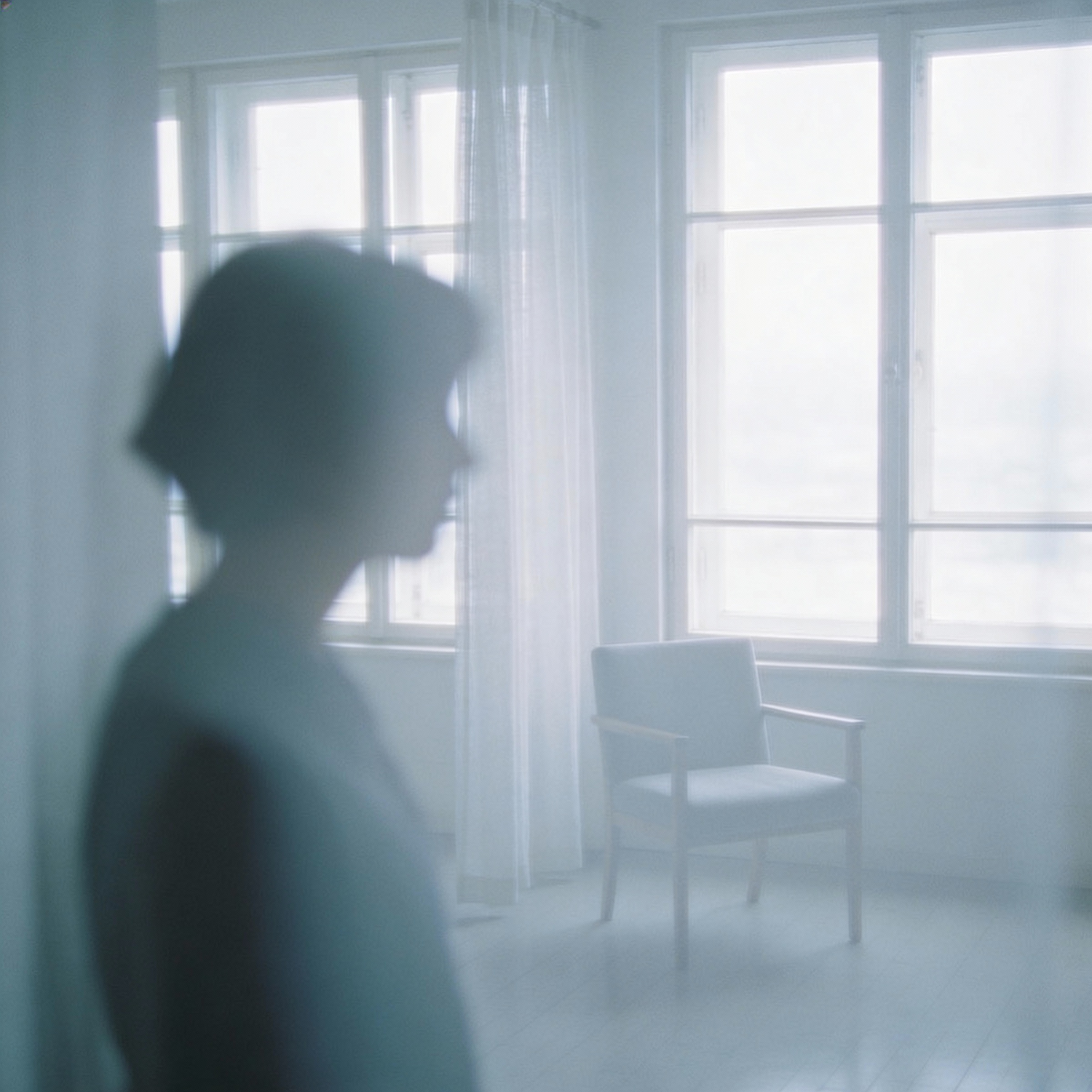 A serene, softly lit room with a silhouette in the foreground and a chair near large windows, creating a minimalist and contemplative vibe.
