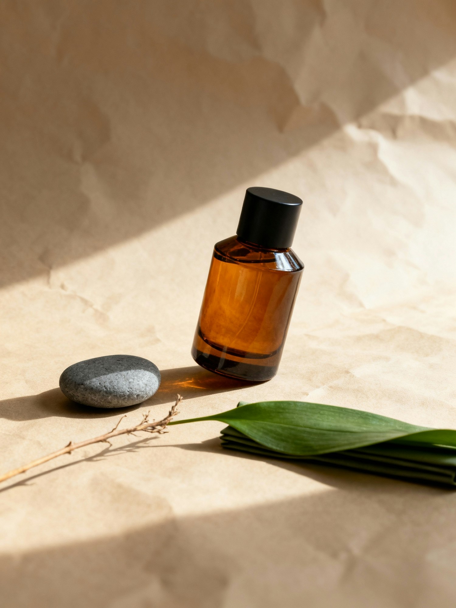 Amber translucent bottle with black cap lying slightly tilted on a warm beige textured paper surface. A smooth pebble, thin dried stem, and a folded green leaf accompany it in a minimal arrangement. Light falls gently from the right, producing soft, layered shadows that feel natural and sculptural. The scene conveys sophistication and organic simplicity.