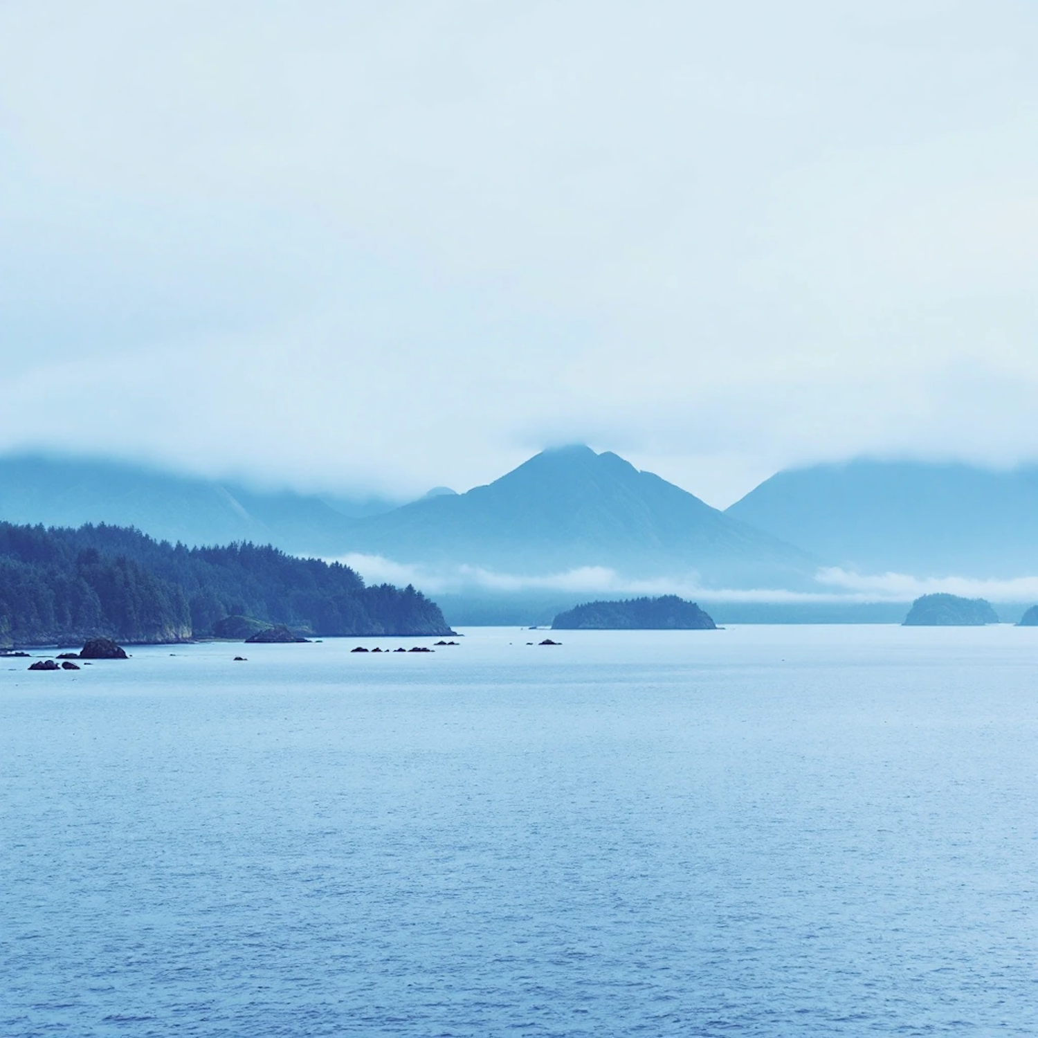 Tranquil seascape with misty mountains and forested islands under an overcast sky, featuring cool blues and greens.