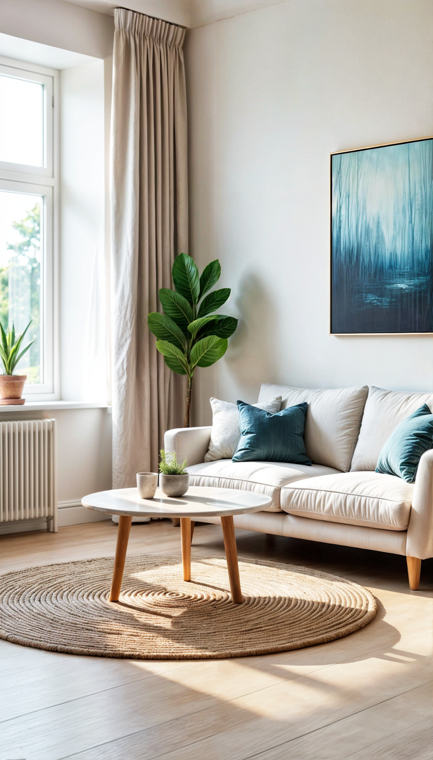 Bright living room with beige sofa, teal cushions, and plants. Features a round coffee table and abstract painting for a serene vibe.