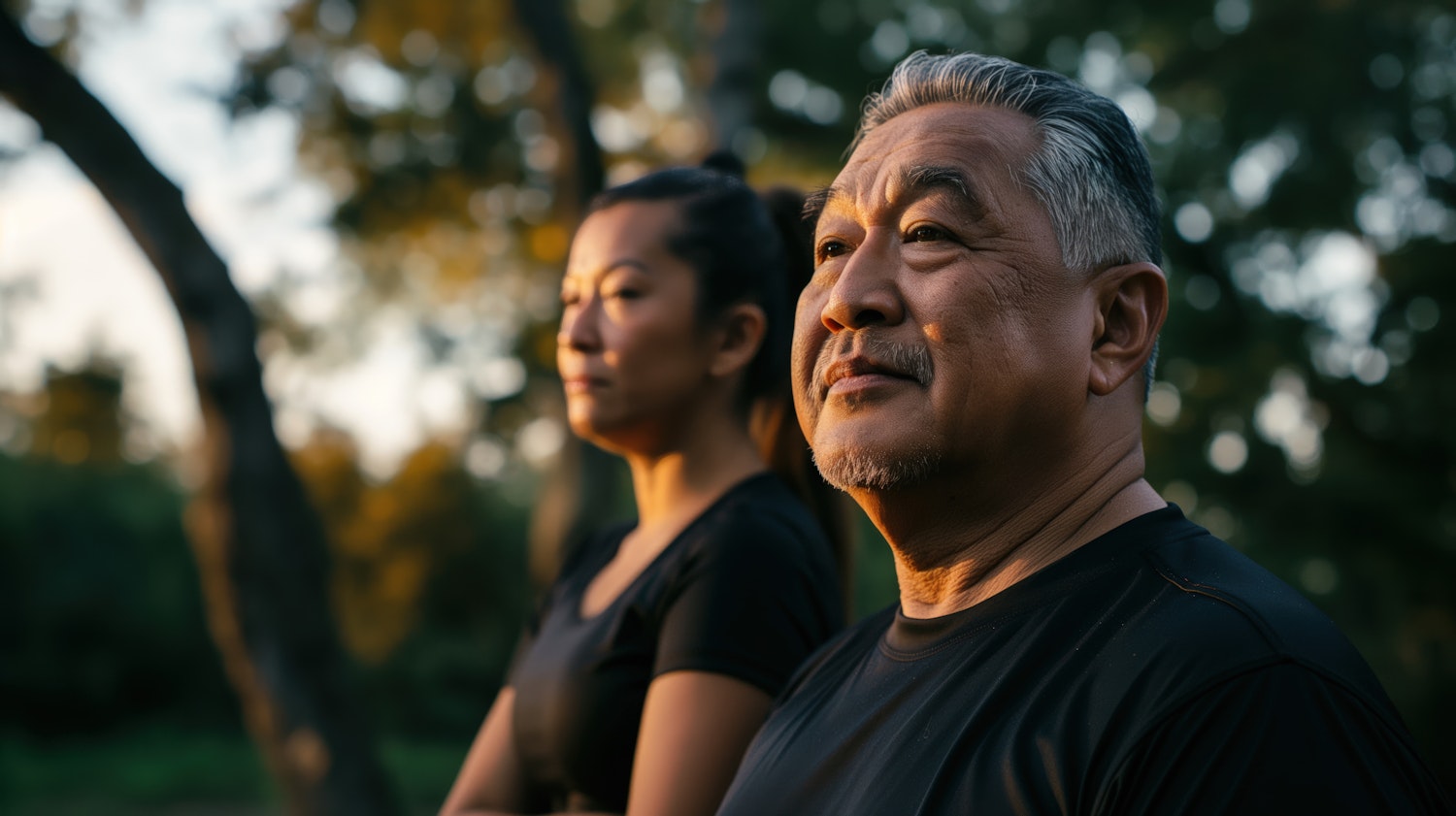 An older Asian man and a younger woman stand in a park, gazing thoughtfully into the distance, bathed in warm sunlight.