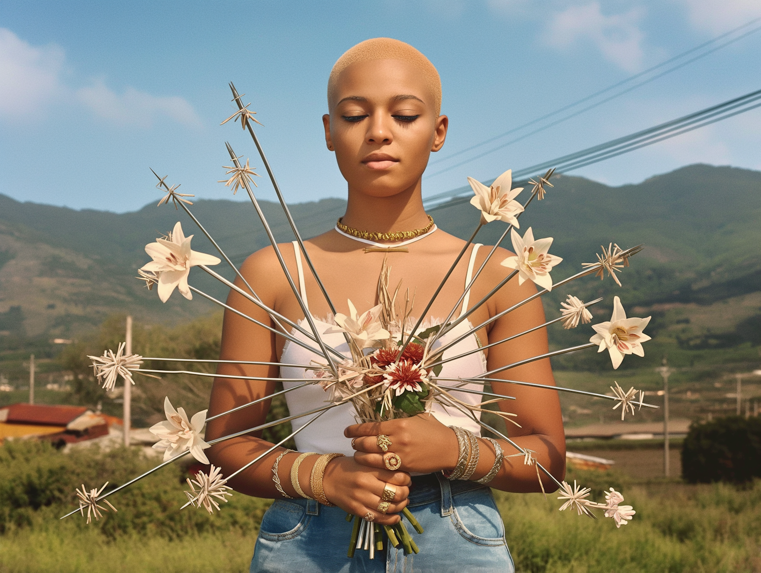 A serene portrait of a woman with a shaved head holding a unique flower bouquet, set against a backdrop of green hills and blue sky.
