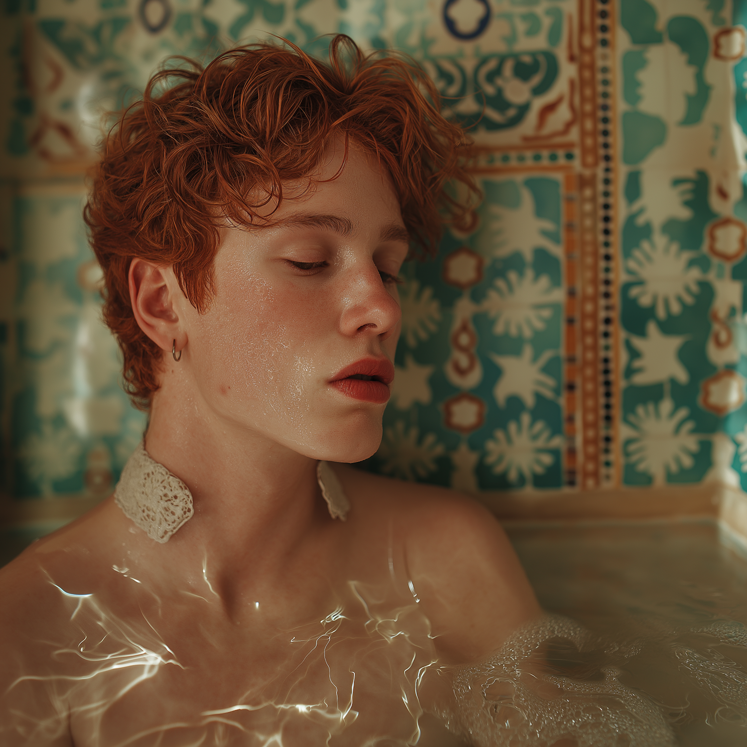 Serene portrait of a red-haired person in a bathtub, surrounded by intricate teal and white tiles, with soft lighting enhancing the scene.