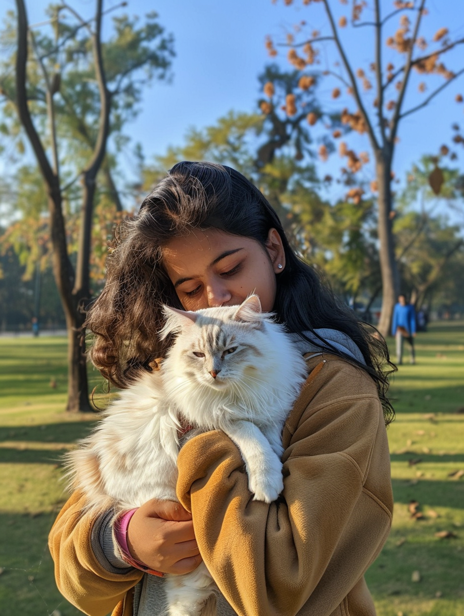 A young woman in a tan jacket holds a fluffy white cat in a sunny park with trees and a clear blue sky in the background.