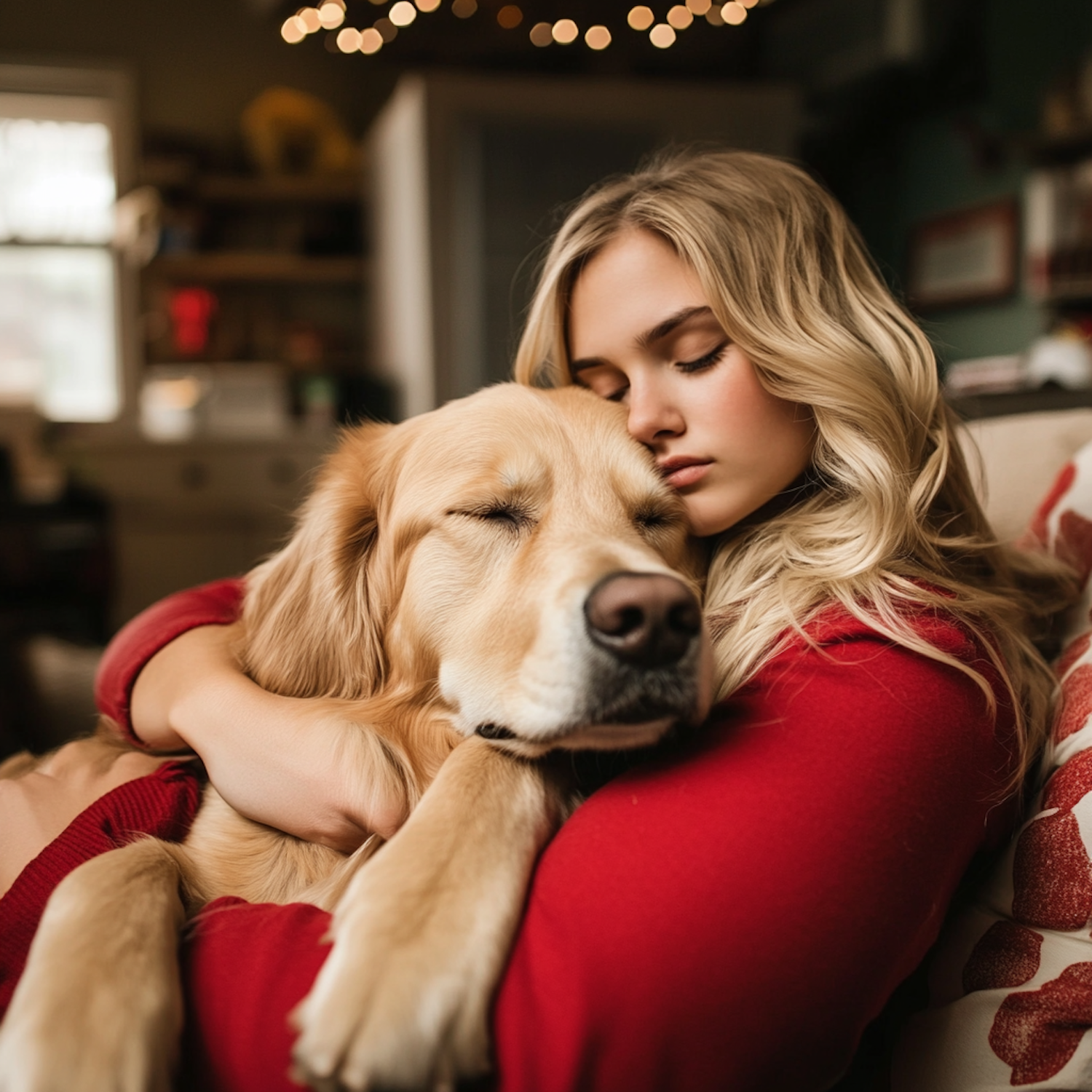A serene moment of a woman in a red sweater hugging her golden retriever, both with eyes closed, in a cozy indoor setting.