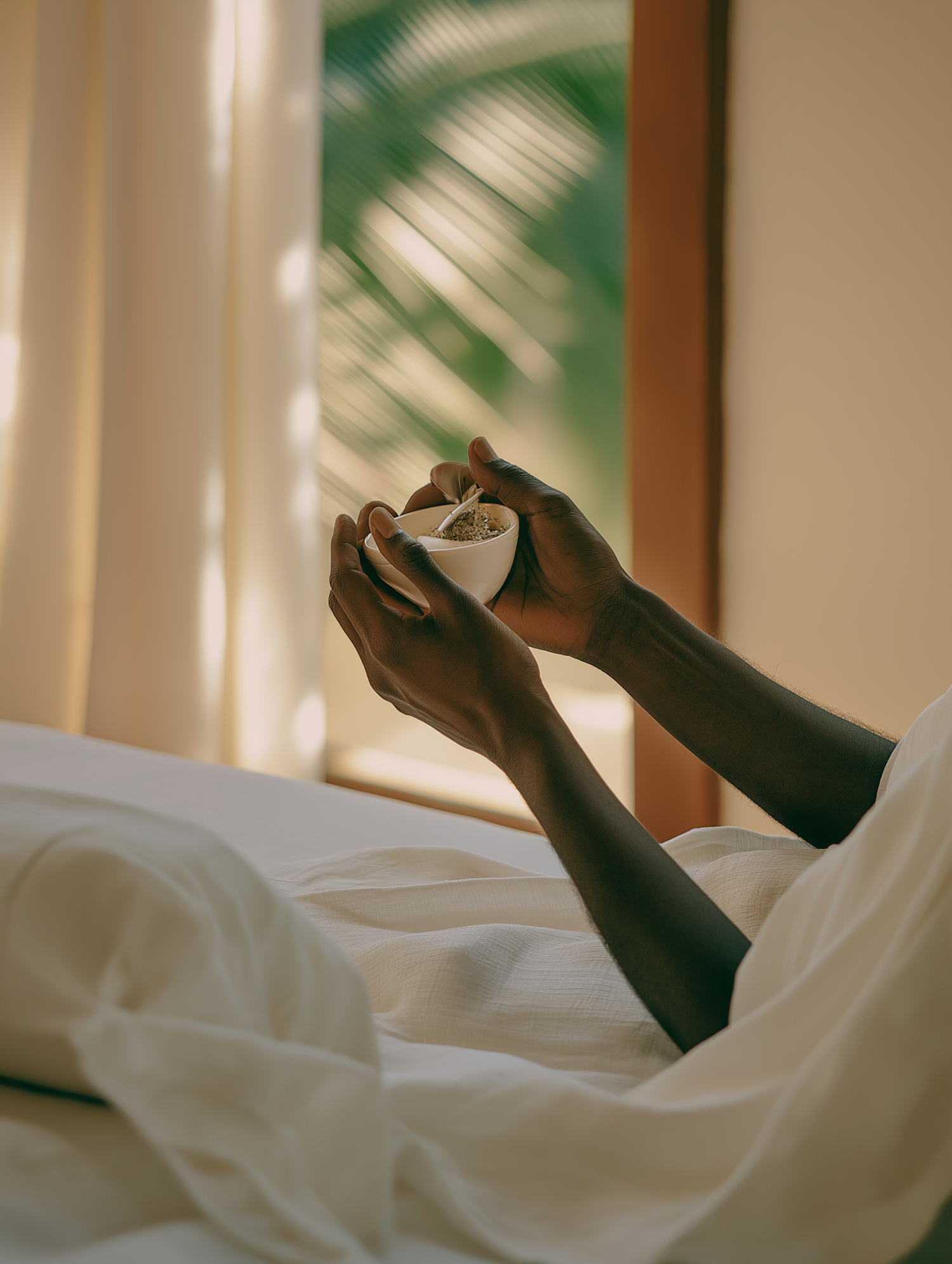 Serene scene of a person holding a bowl in bed, with soft light filtering through curtains, creating a tranquil atmosphere.