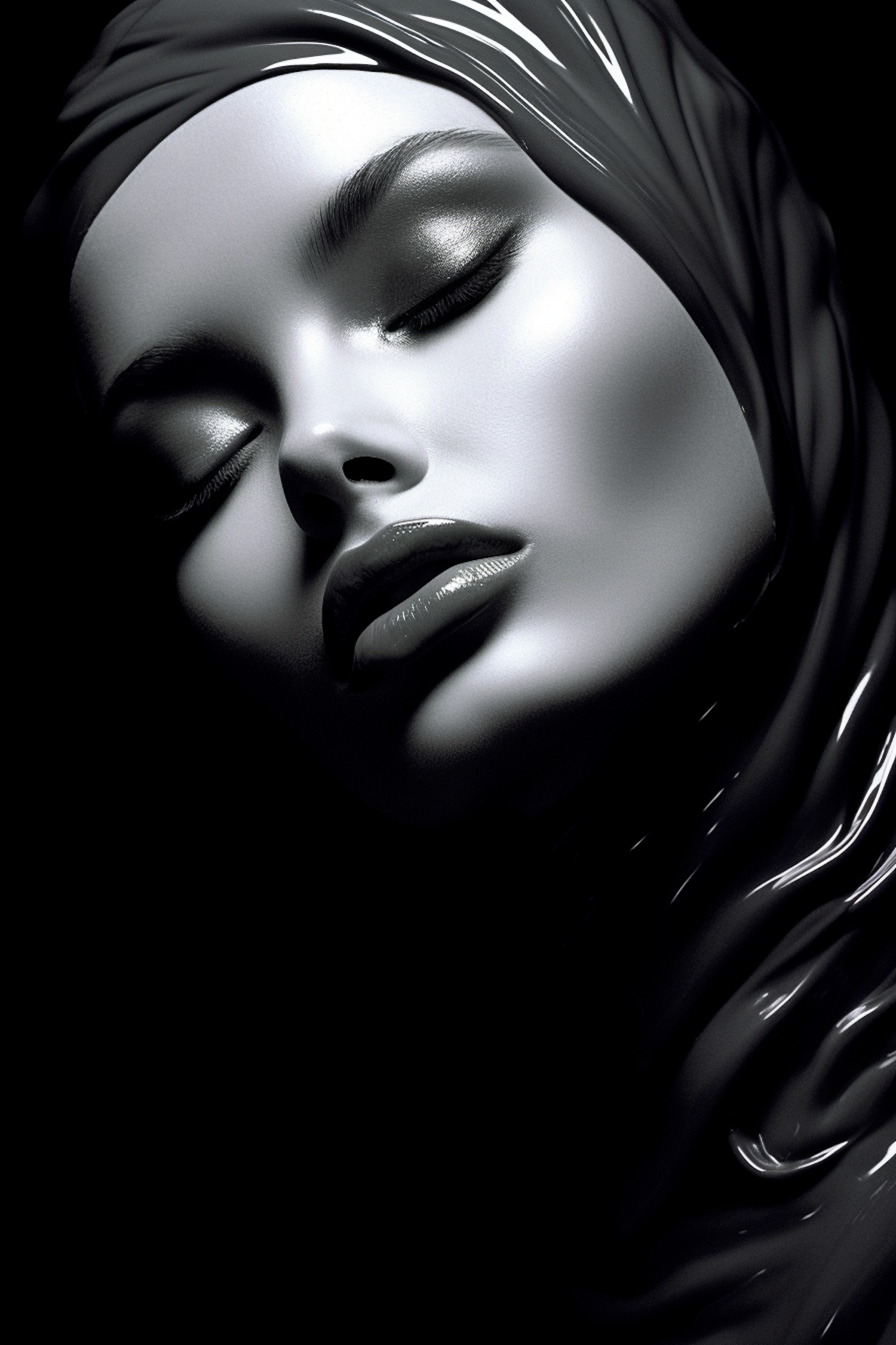 Monochrome portrait of a serene woman with closed eyes, draped in glossy material, creating a futuristic and artistic feel.