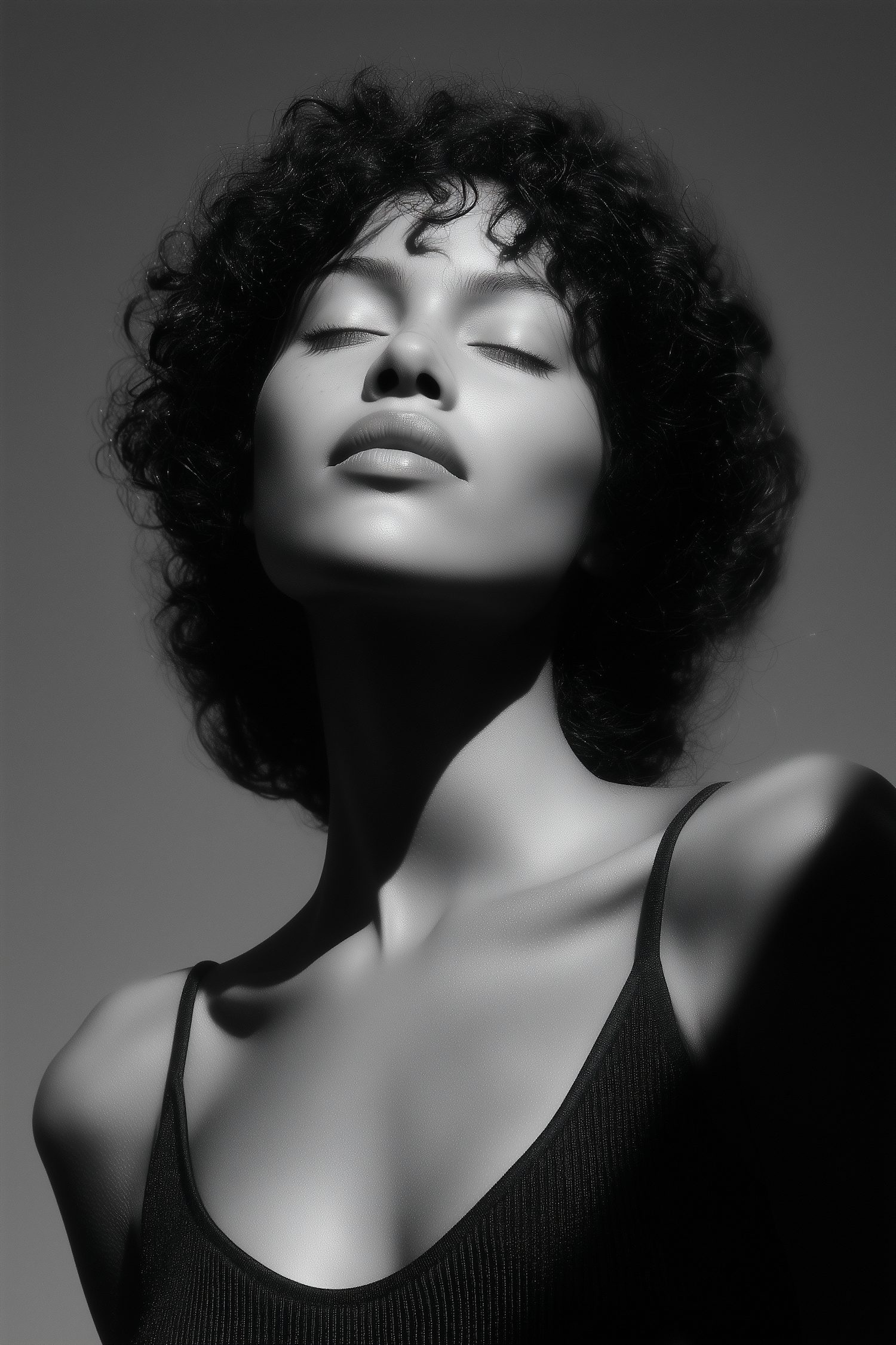 Monochrome portrait of a serene individual with curly hair and dramatic lighting emphasizing facial contours.