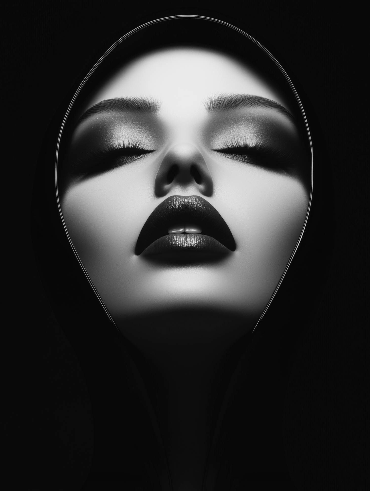 Dramatic black and white portrait with closed eyes and dark lips, framed by shadows, creating a mysterious and elegant mood.