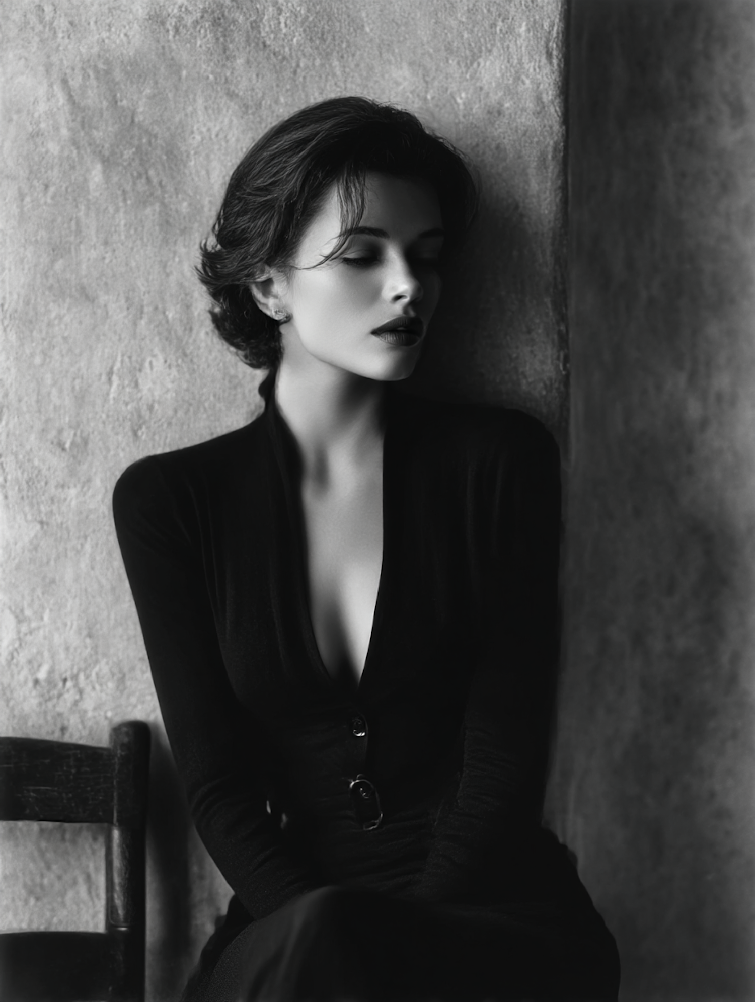 A black-and-white portrait of a woman in a dark dress, seated against a textured wall, with a serene expression and soft lighting.