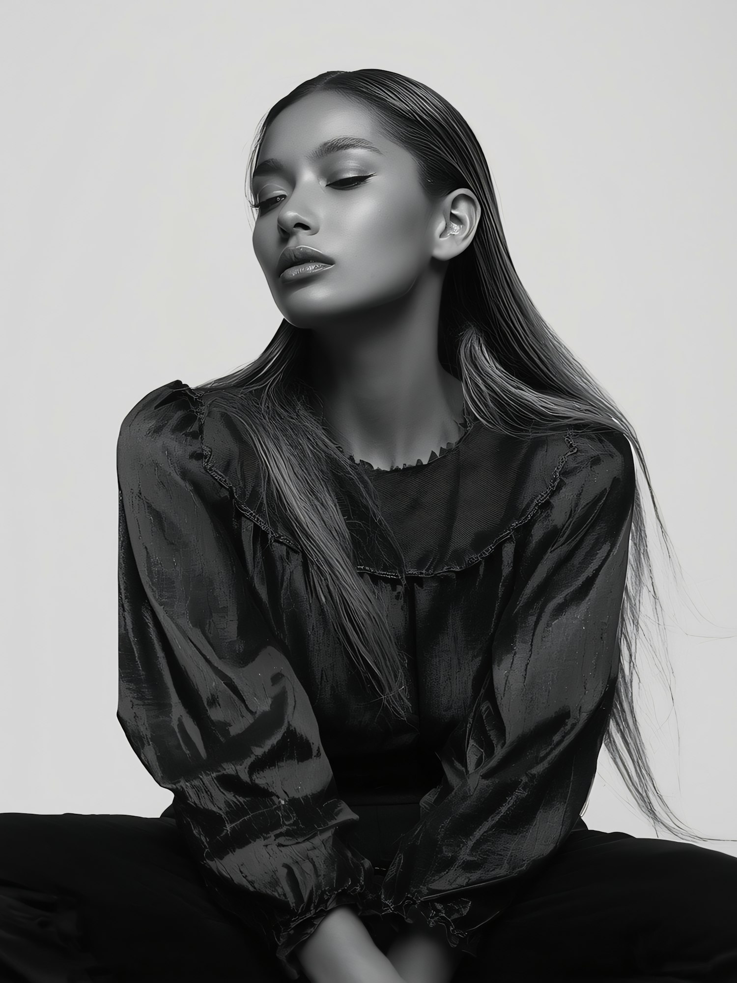 Monochrome portrait of a serene woman with sleek hair and a textured blouse, showcasing elegance and simplicity in a neutral setting.